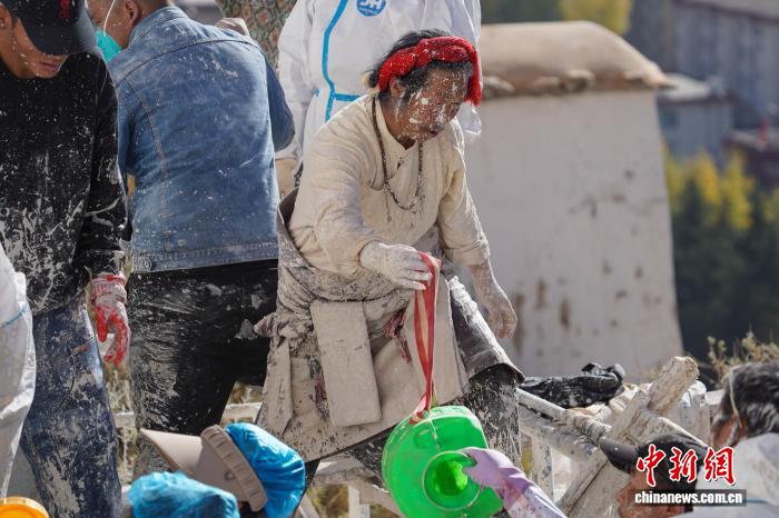 民众前往涂料搅拌点,准备搬运布达拉宫粉刷使用的涂料。中新网