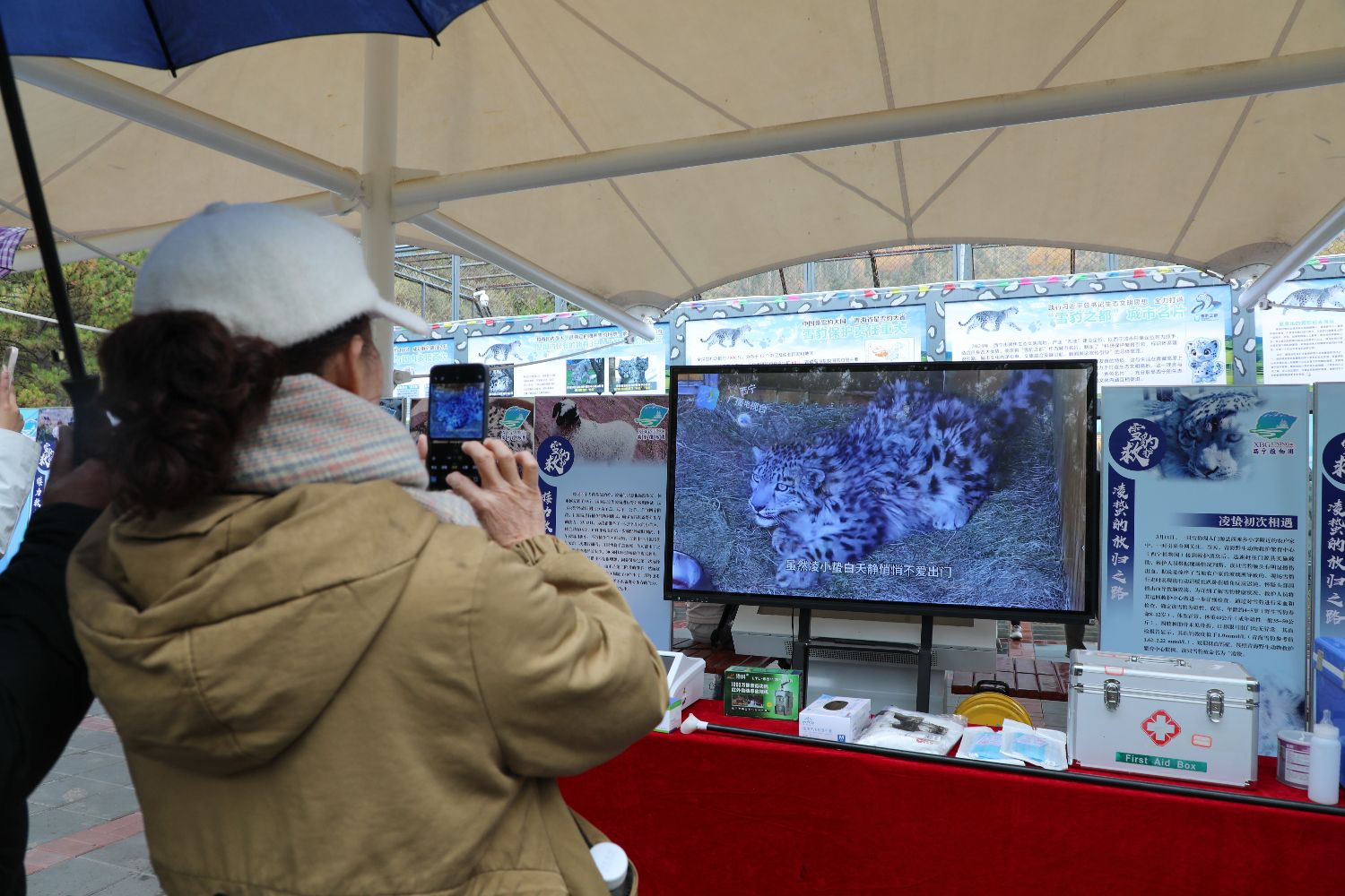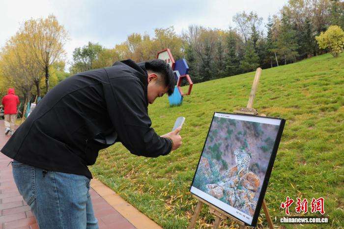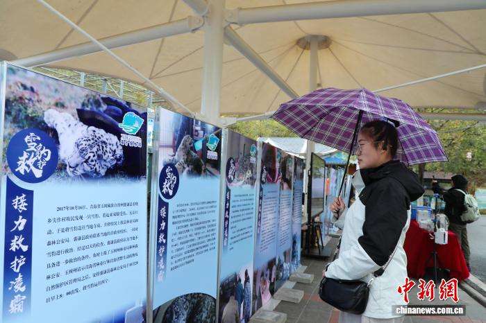10月23日,2025年青海省“国际雪豹日”宣传活动启动仪式在西宁野生动物园举行。活动现场展出雪豹主题文创、文学、美术及摄影作品等,为民众搭建参与生物多样性保护的平台,关注雪豹及其赖以生存的高山生态系统。图为游客观看纪实影片,了解雪豹“救护-繁育-研究-放归”全脉络核心成果。中新社