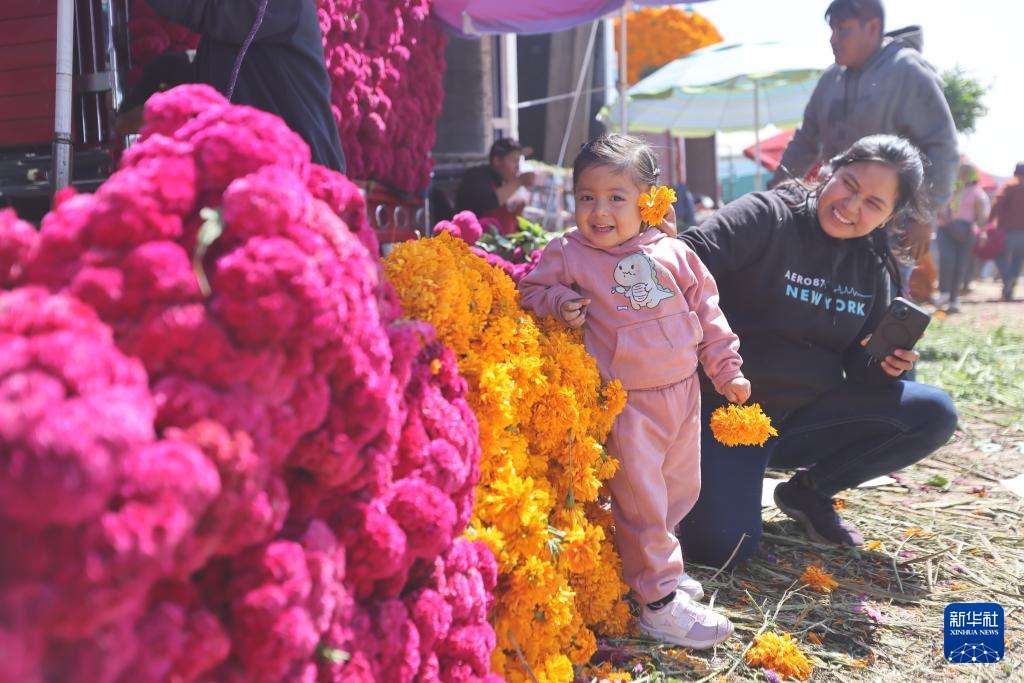 墨西哥城的供应中心是最重要的物资供应批发市场。随着亡灵节的临近,大量万寿菊等节日所需农副产品及装饰物品在市场上热销。图为10月29日,在墨西哥首都墨西哥城的供应中心,儿童在出售亡灵节鲜花的摊位旁玩耍。
