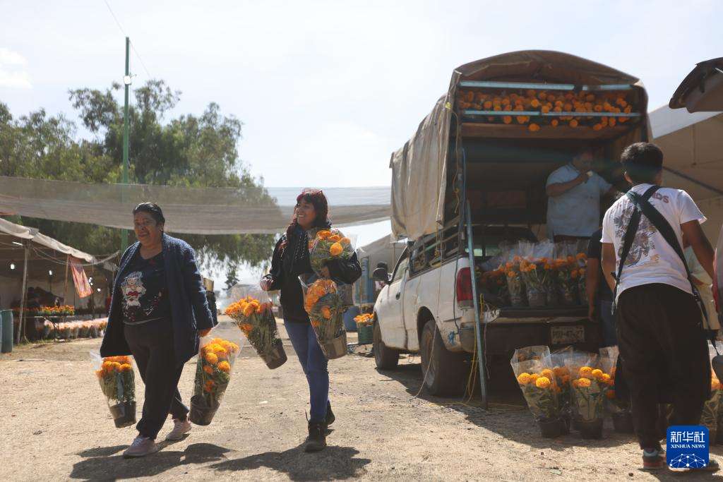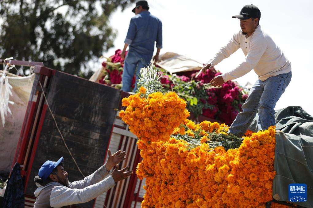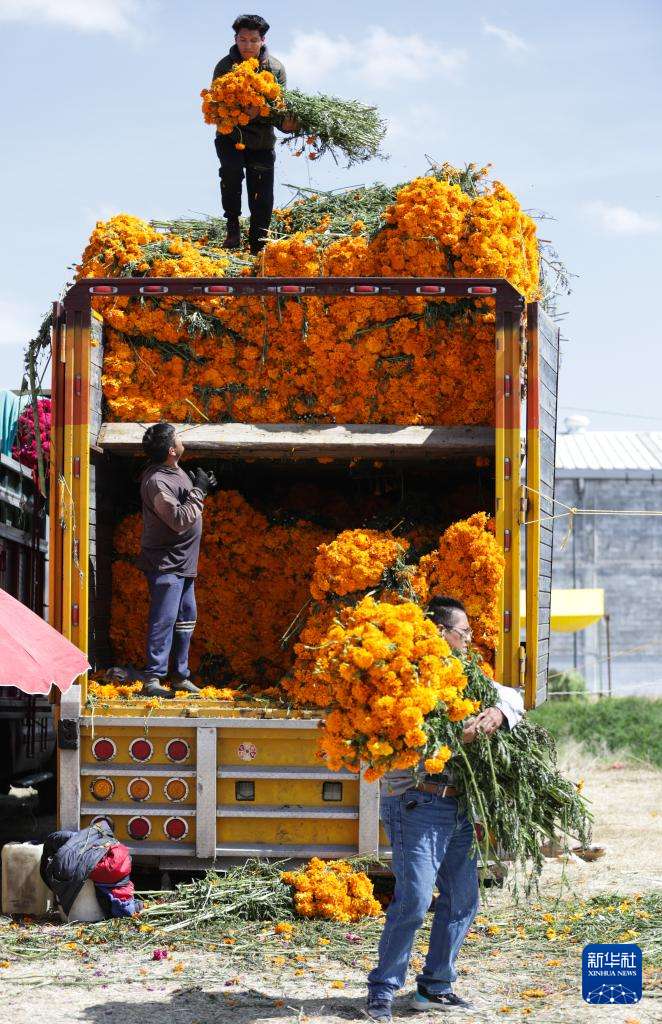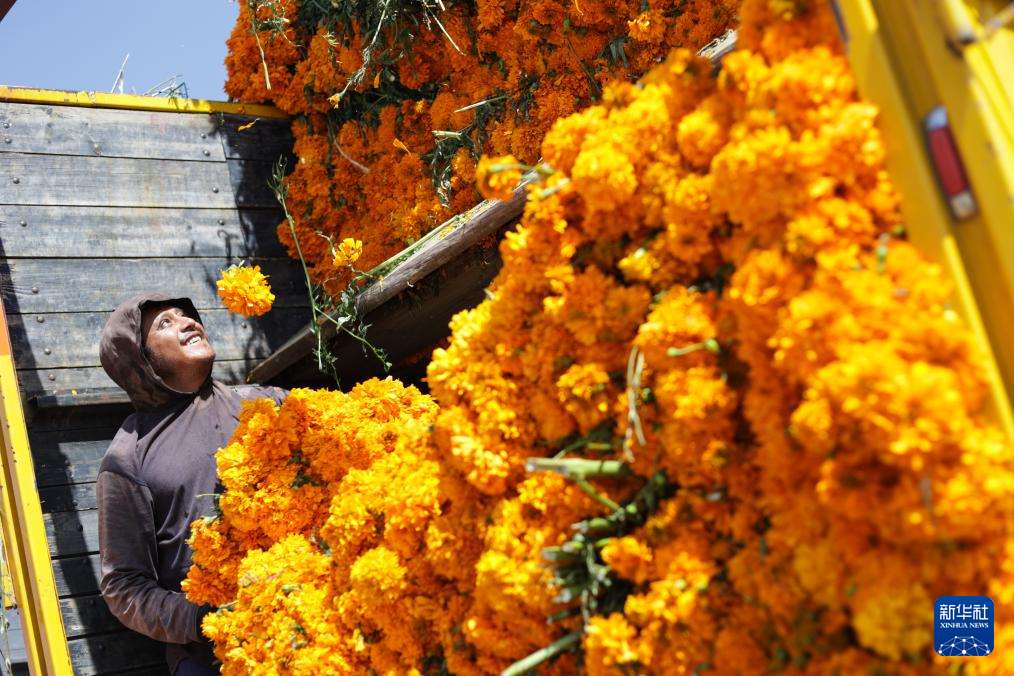 10月29日,在墨西哥首都墨西哥城的供应中心,摊贩在亡灵节前集中销售万寿菊。