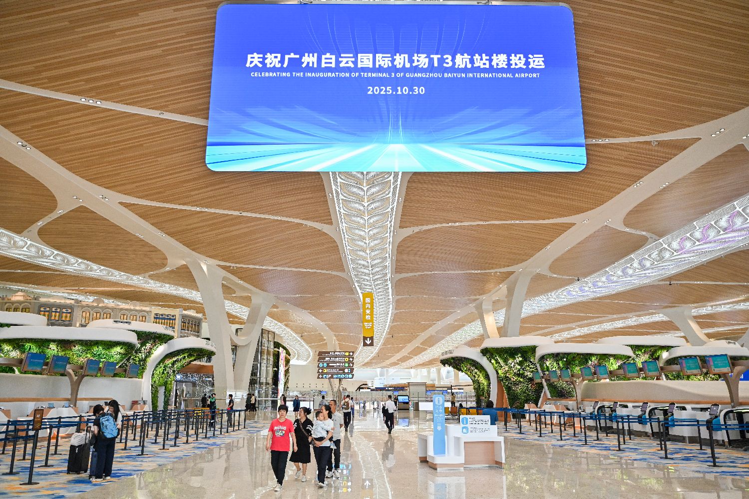 10月30日,广州白云国际机场第三座航站楼(T3航站楼)、第五跑道正式投入运行,标志着该机场进入“五条跑道+三座航站楼”运行时代,并成为中国民航首个五条商用跑道同时运行的机场。T3航站楼建筑造型以“花”为设计主题,融入“云山珠水”“花城”的广州特点。中新社