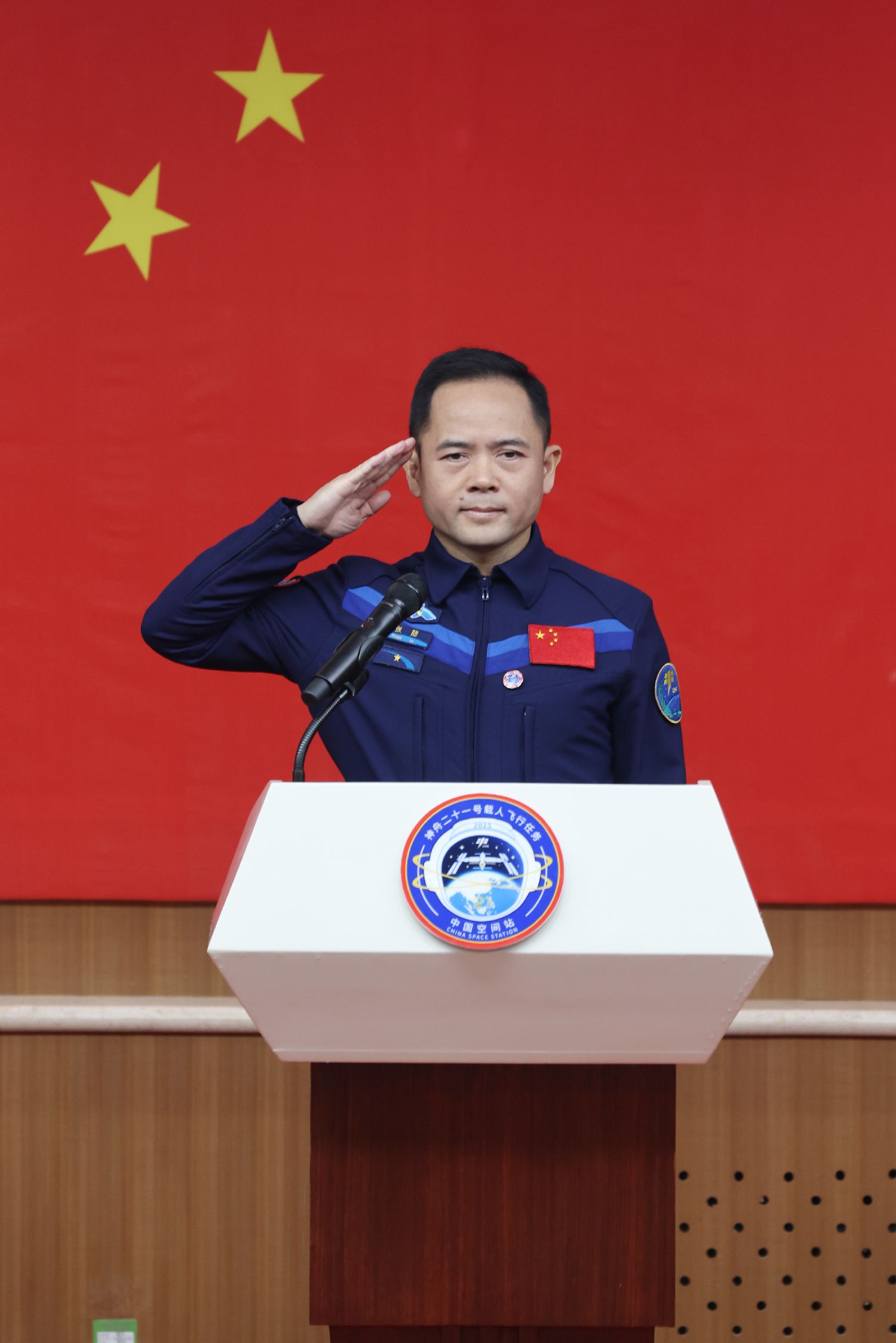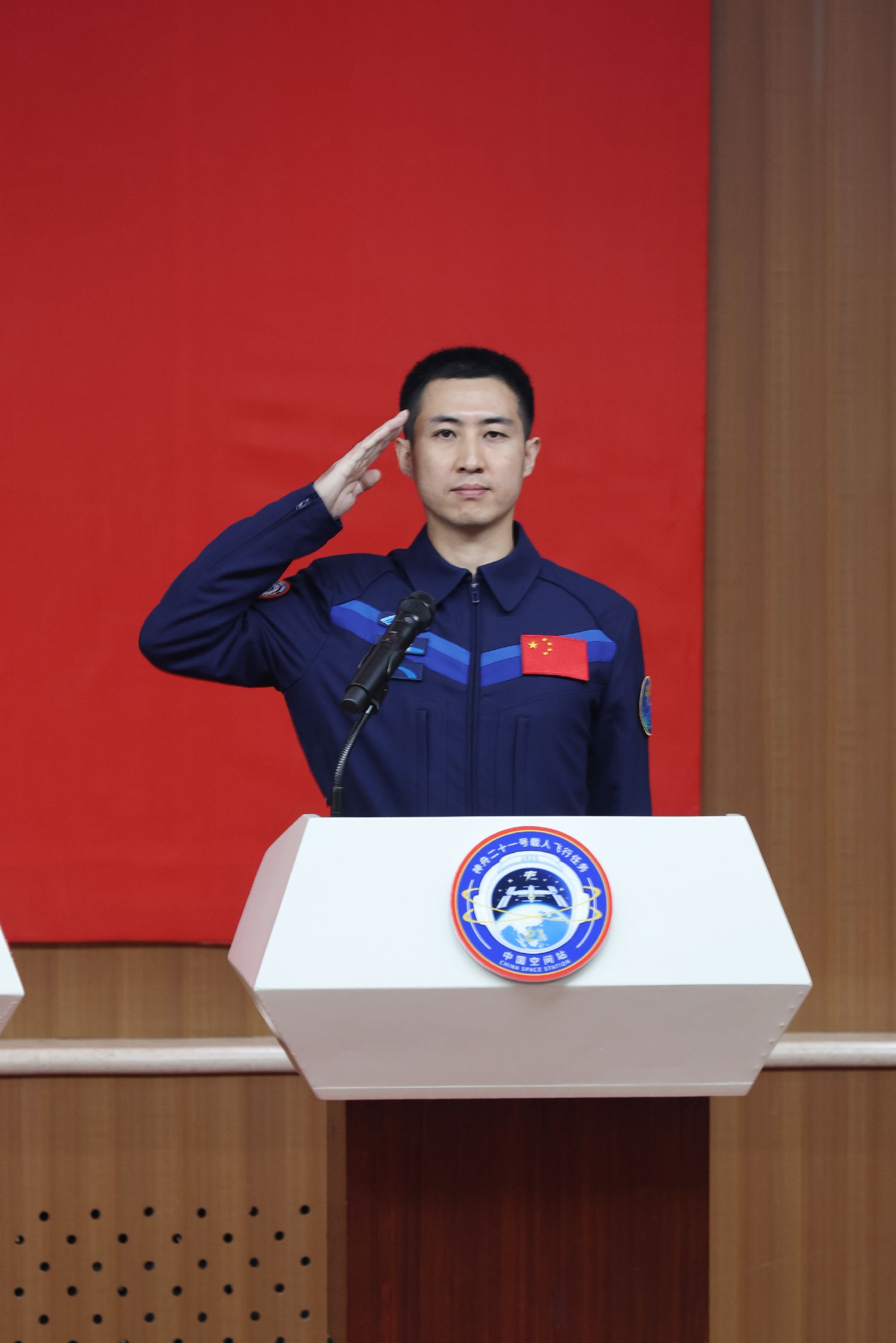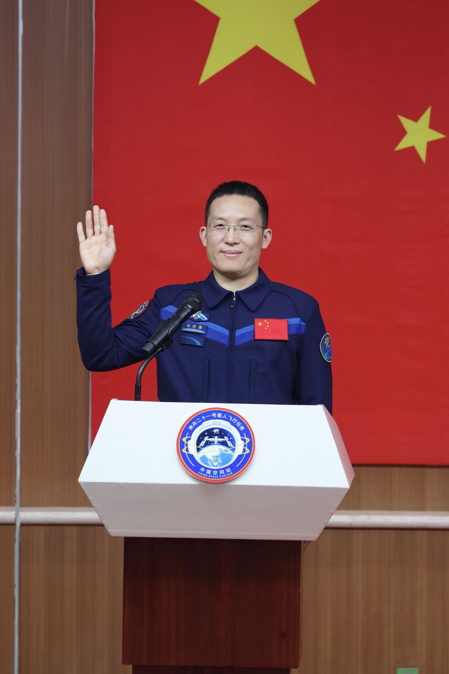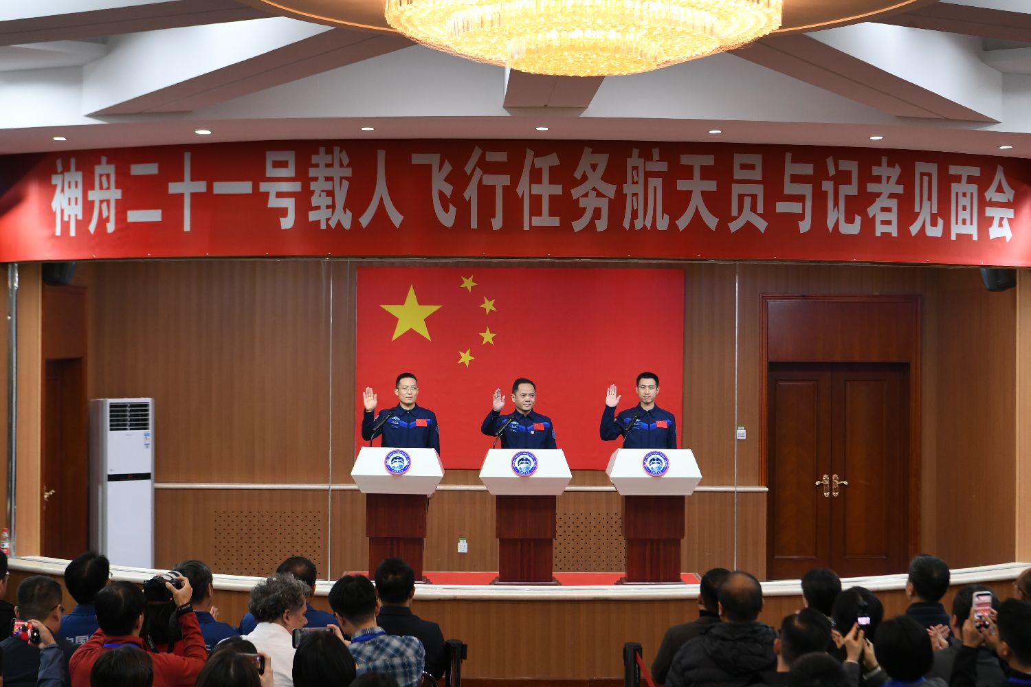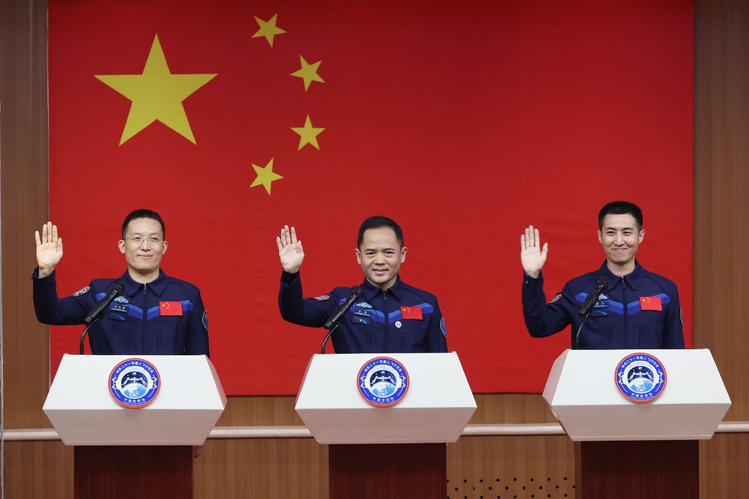 10月30日,神舟二十一号乘组3名航天员在位于甘肃酒泉的酒泉卫星发射中心问天阁与中外媒体记者集体见面。图为神舟二十一号载人飞行任务航天员张陆(中)、武飞(右)、张洪章在酒泉卫星发射中心问天阁与媒体记者集体见面。