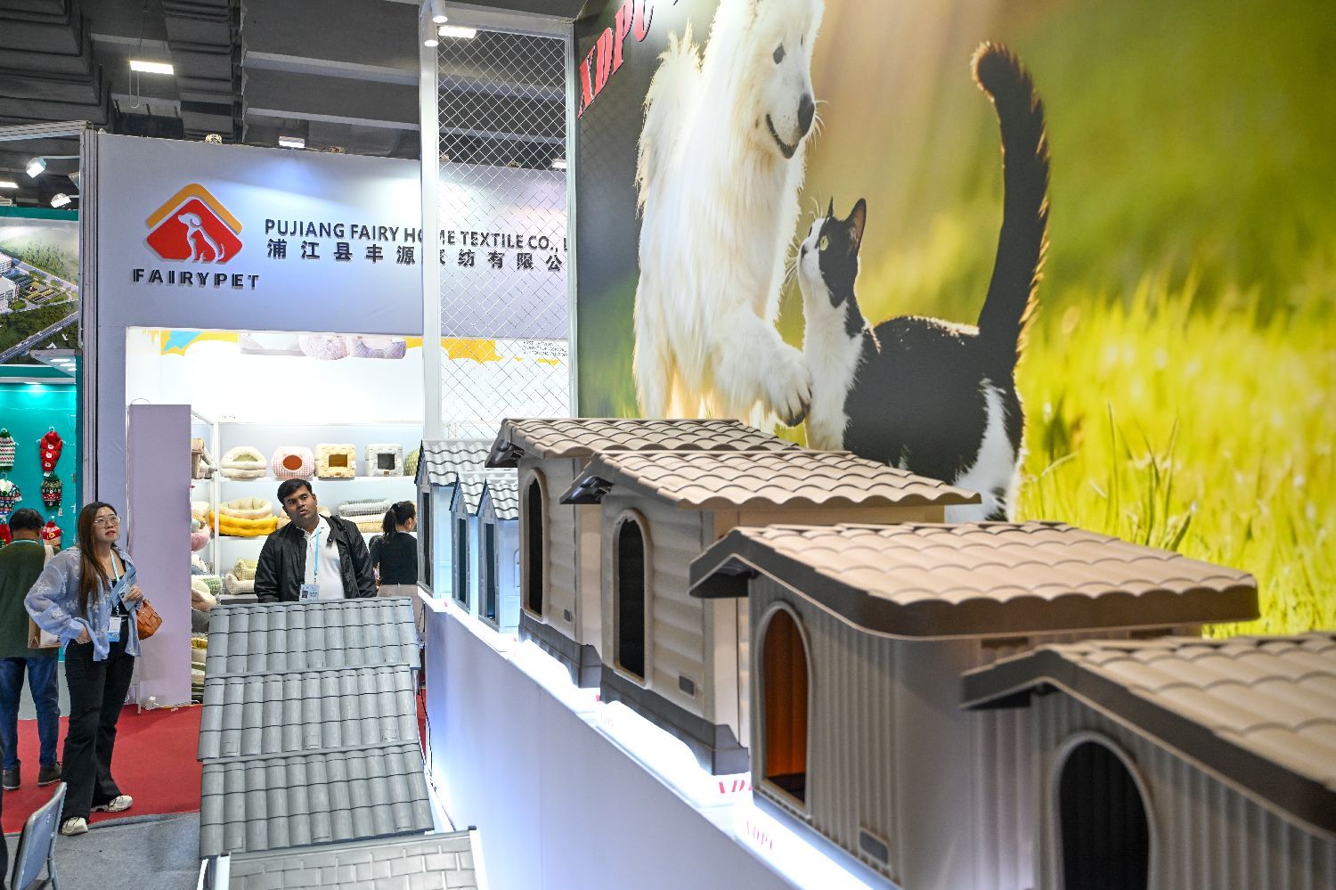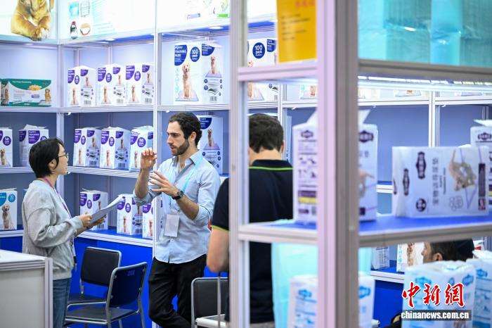 11月3日,境外采购商在广交会宠物用品展区与参展商洽谈。中新网