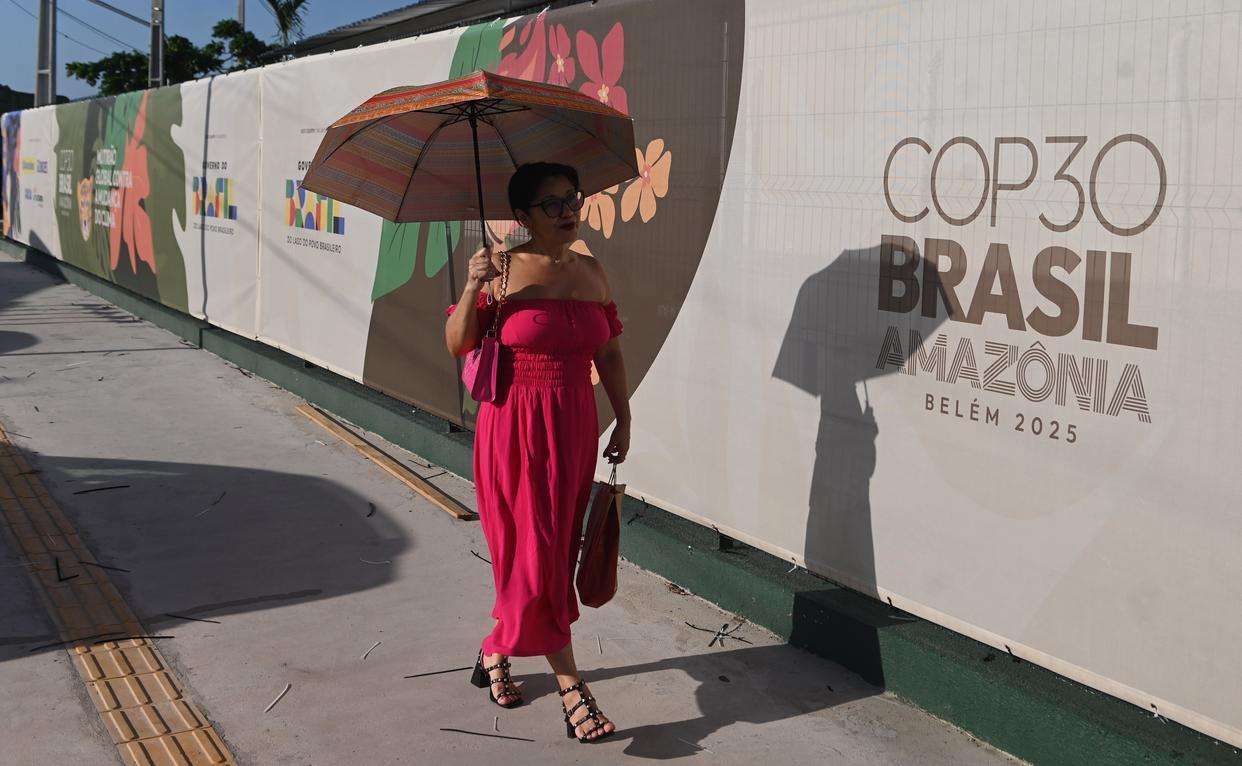 11月4日,一名女子从贝伦城市公园外《联合国气候变化框架公约》第三十次缔约方大会(COP30)的标识前经过。新华社