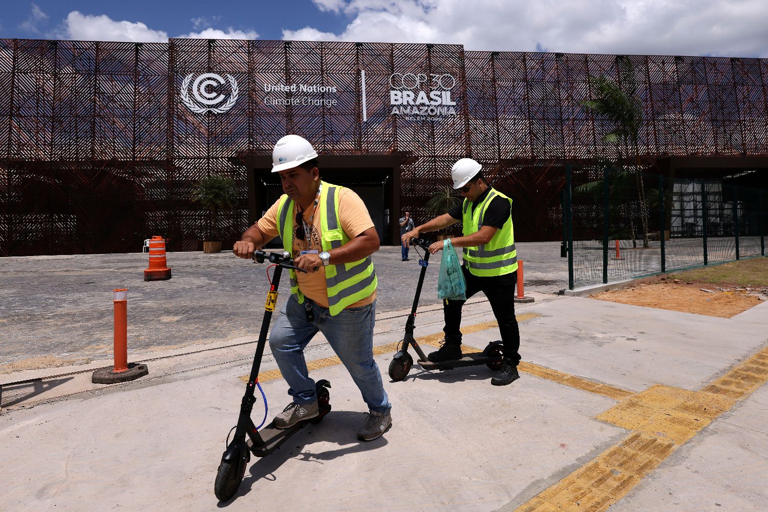 随着COP30临近,巴西正全力塑造一个准备充分、具有战略眼光且致力于应对气候变化的主办国形象。图为11月3日,工人们骑着电动滑板车从会场外经过。视觉中国