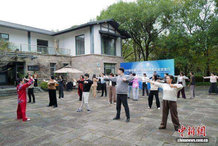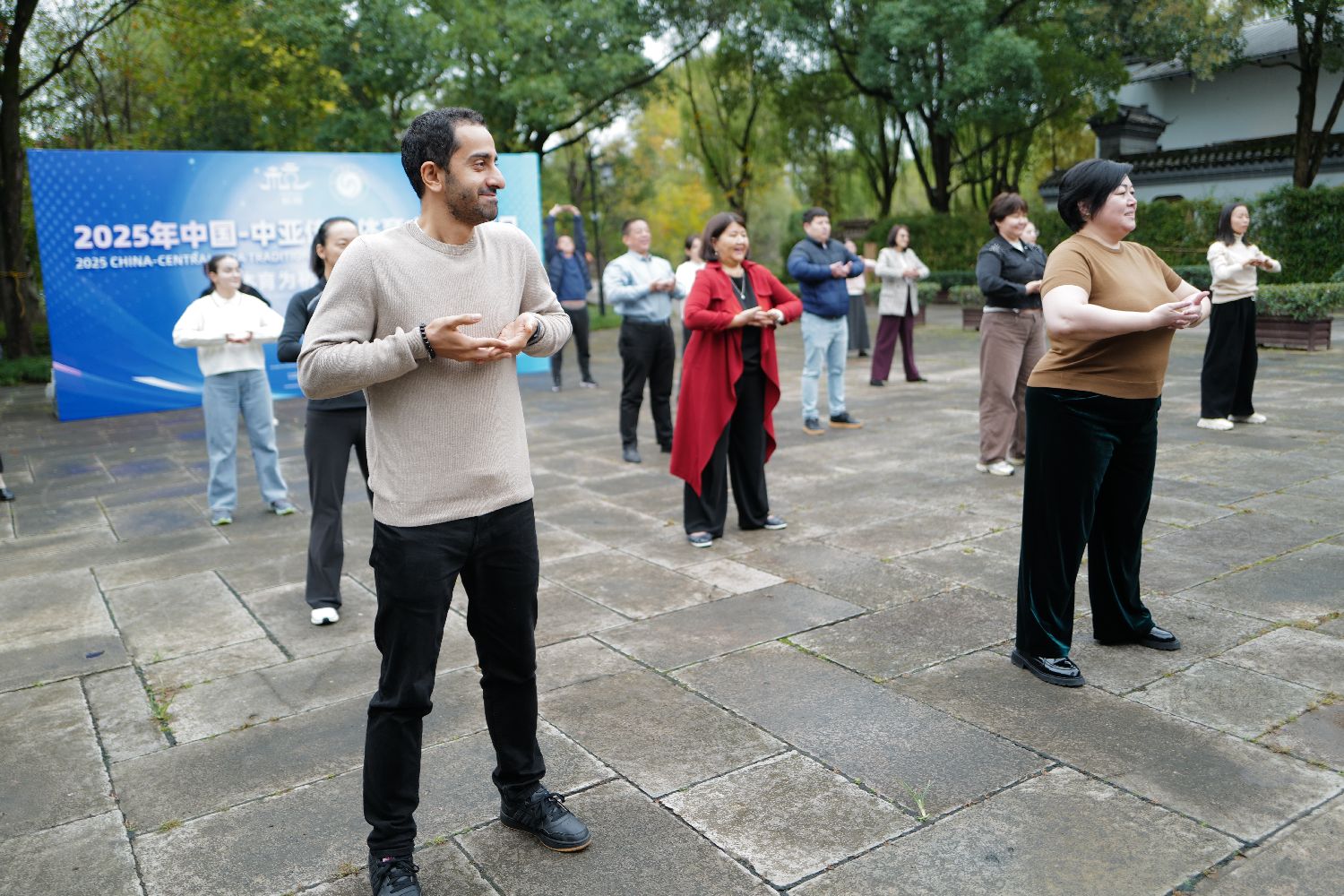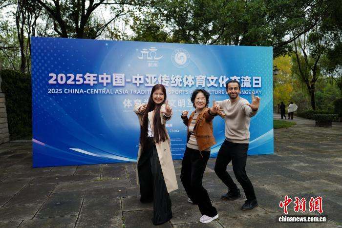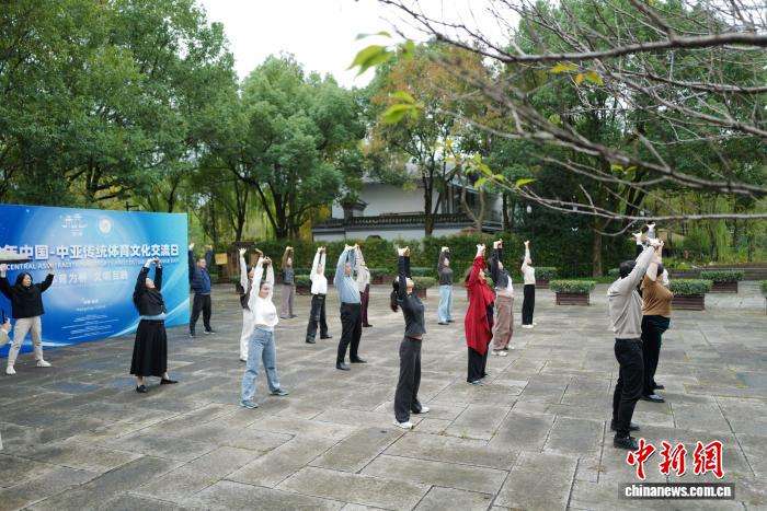 11月9日,2025年中国-中亚传统体育文化交流日活动在杭州举行,来自哈萨克斯坦、乌兹别克斯坦等国的中亚友人以及来自多所中国高校的师生同练八段锦,感受中国传统养生功法的魅力。图为当日,中亚友人与中国师生共同习练八段锦。中新社