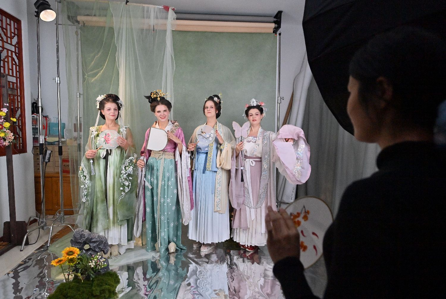 11月9日,在吉林长春的一家汉服体验馆,德国友人身着精美汉服拍摄写真。中新社