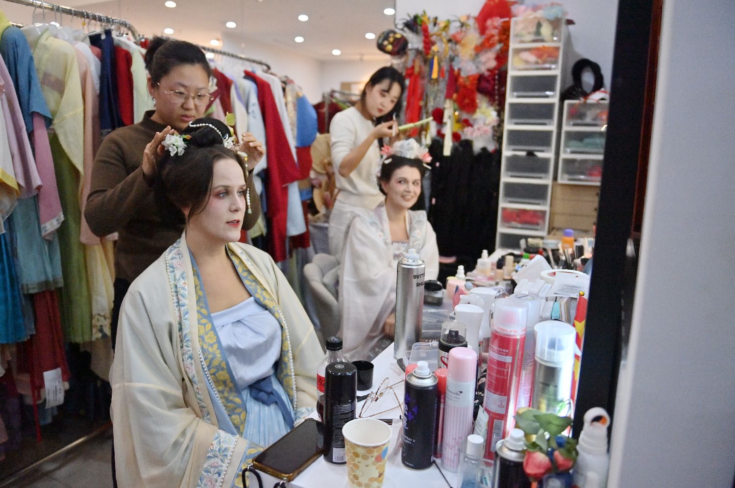 11月9日,在吉林长春的一家汉服体验馆,德国友人在进行汉服妆造。中新社