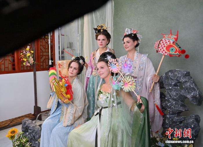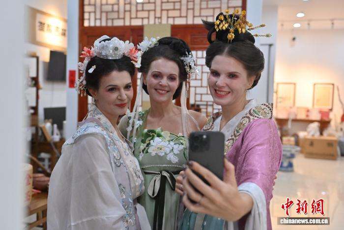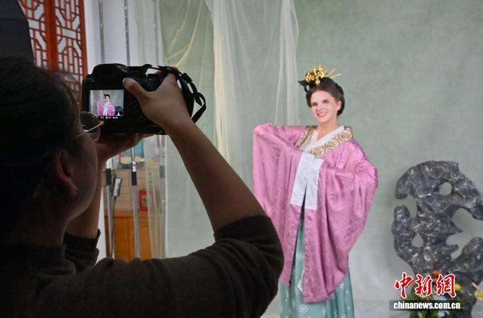 11月9日,在吉林长春的一家汉服体验馆,德国友人身着精美汉服拍摄写真。中新网
