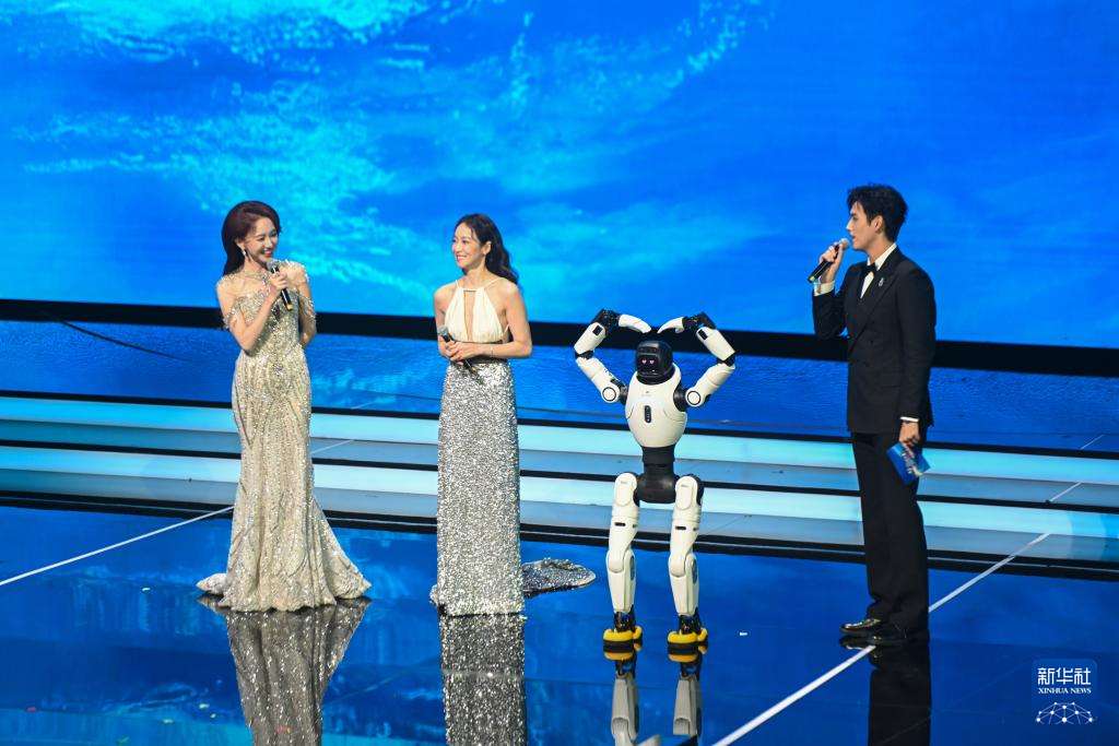 11月11日晚,主持人在2025年中国金鸡百花电影节开幕式现场与机器人互动。新华社