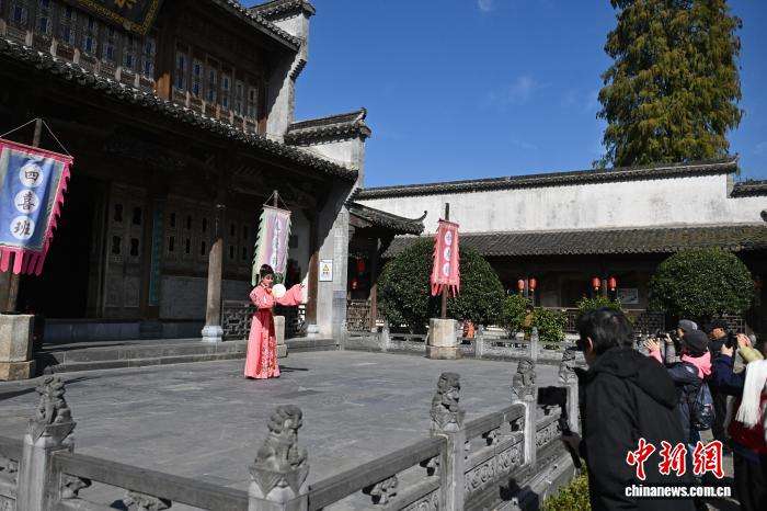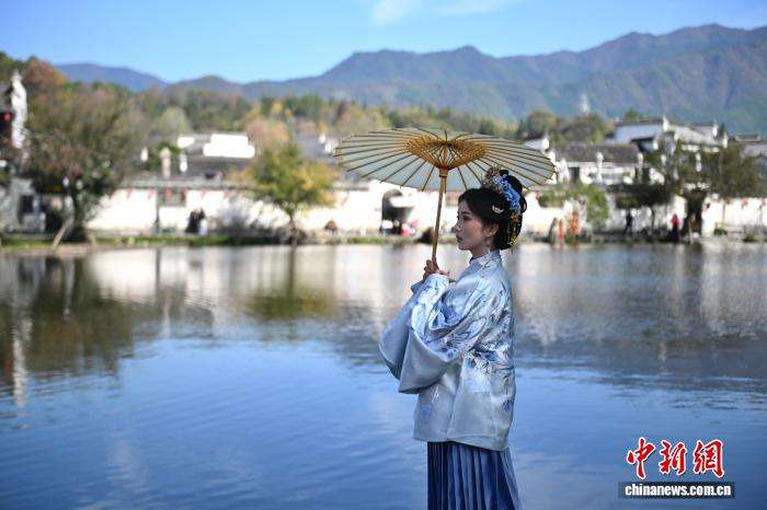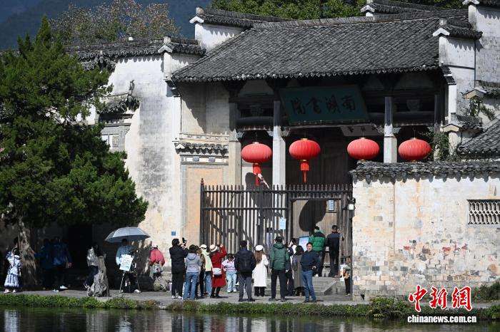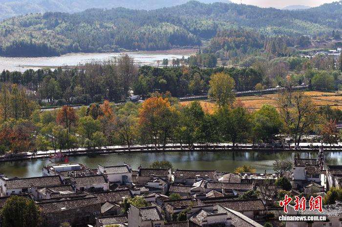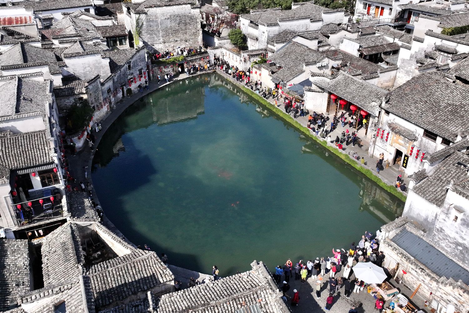 11月18日,海外华文媒体代表在安徽黟县的青山绿水与徽州古建筑中沉浸式感受“中国画里乡村”的独特韵味,探寻传统村落的现代活力。图为航拍安徽省黄山市黟县宏村月沼。中新社