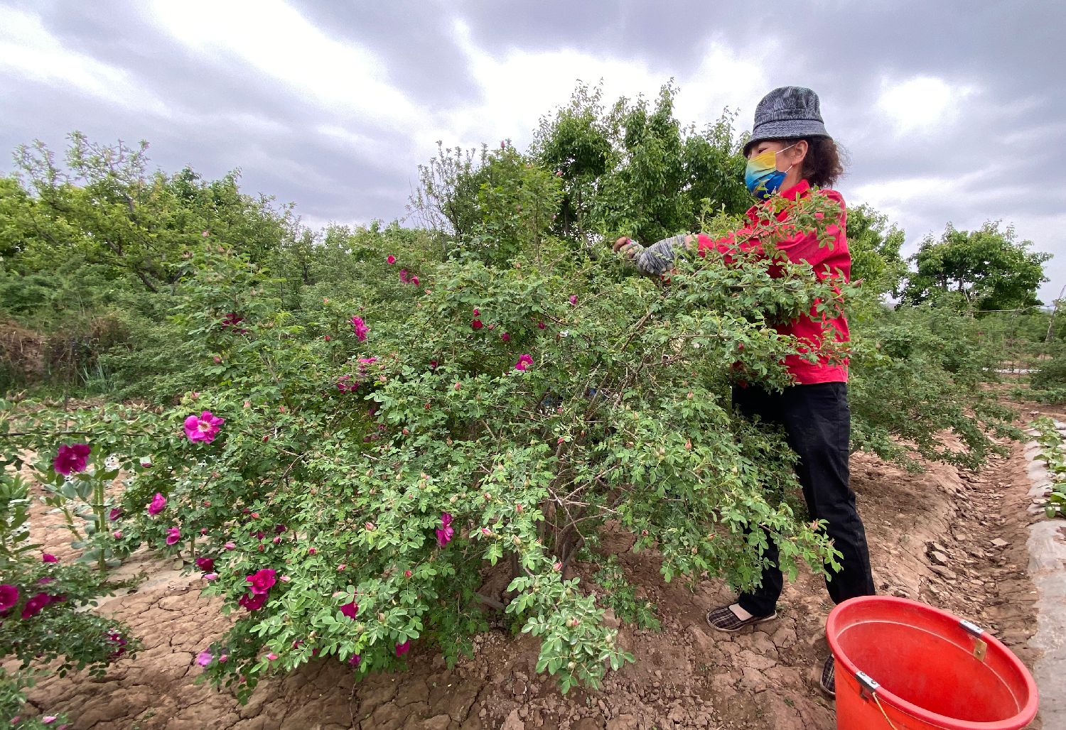 资料图为甘肃兰州市永登县,花农采摘苦水玫瑰花。中新社