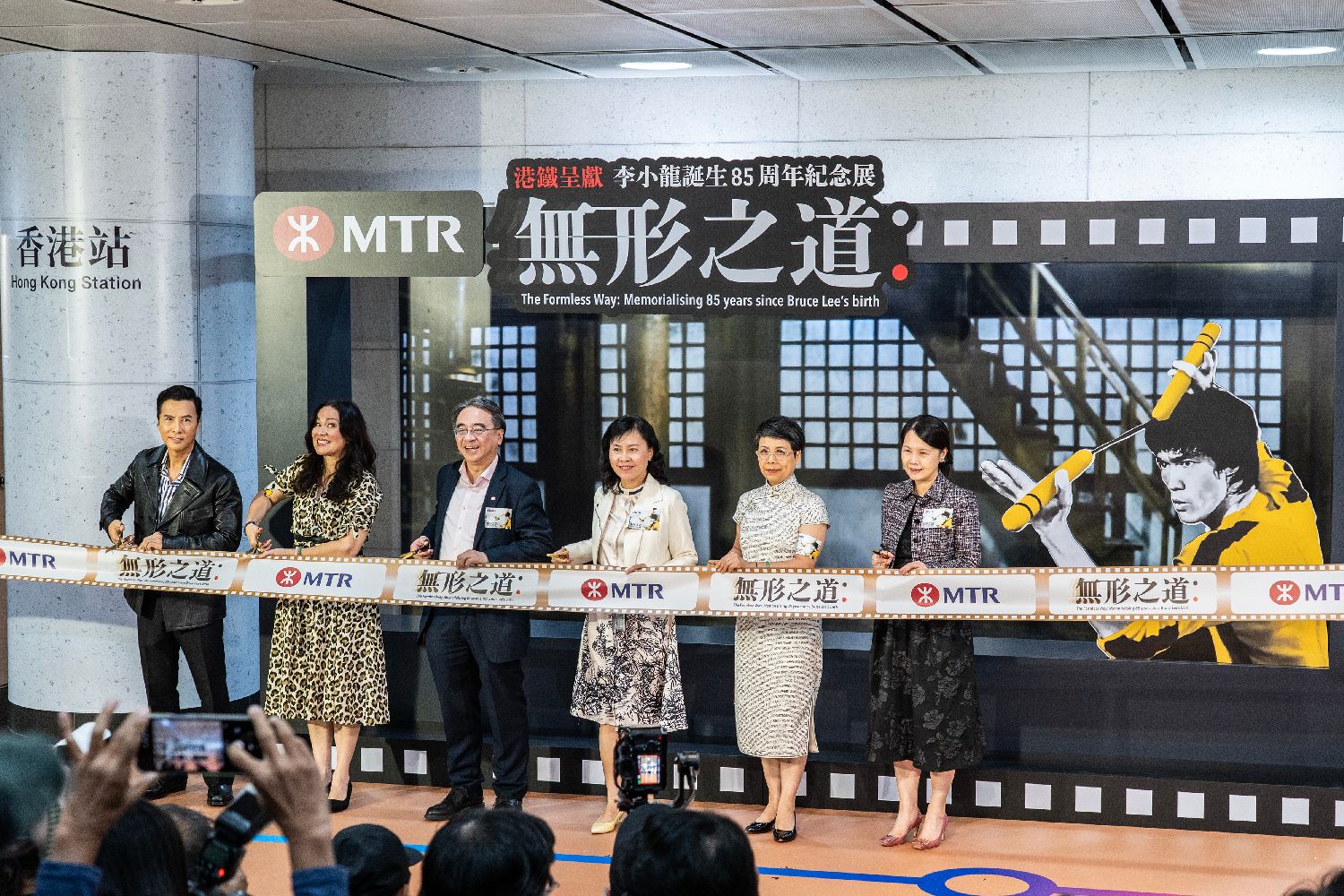 11月24日,香港铁路有限公司在地铁香港站内举办“无形之道:李小龙诞生85周年纪念展”揭幕仪式。此次展览在地铁香港站和中环站内设置展区,从电影、武术、哲学和艺术四个方面向市民及游客展示李小龙的武术精神和人生哲学。图为香港特区政府运输及物流局局长陈美宝(右三),港铁公司行政总裁金泽培(左三),李小龙基金会创办人兼会长、李小龙之女李香凝(ShannonLee,左二),动作影视明星甄子丹(左一)等嘉宾为展览剪彩。中新社