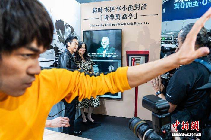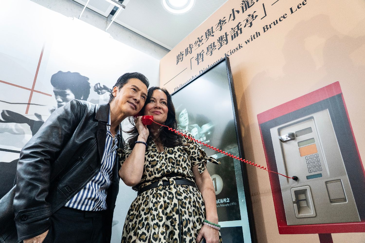 李小龙基金会创办人兼会长、李小龙之女李香凝(ShannonLee,右)和动作影视明星甄子丹在展览的“电话亭”互动区域聆听李小龙的声音。中新社