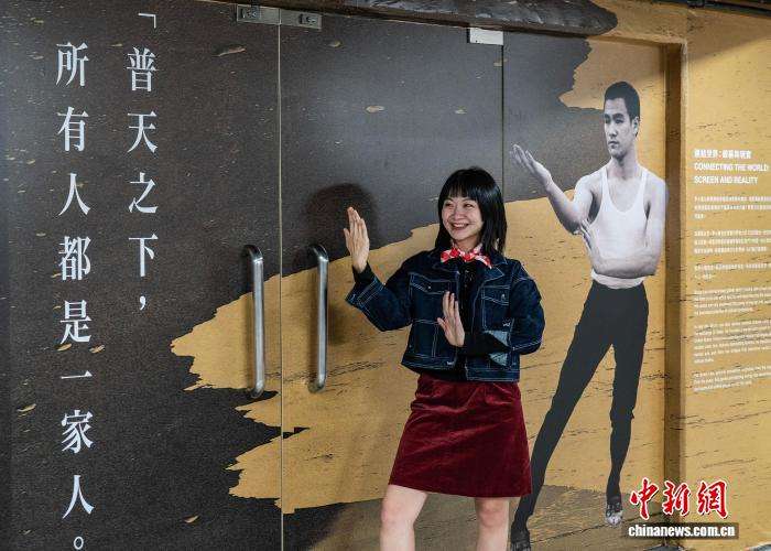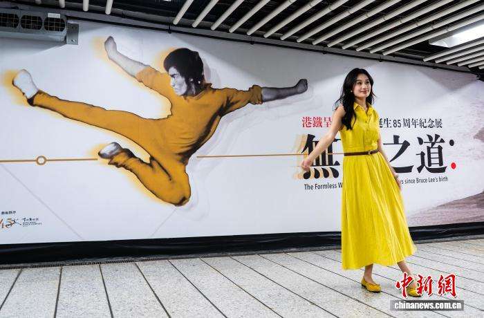 一位女士在港铁中环站内的特展区域内模仿海报上李小龙的动作。中新网