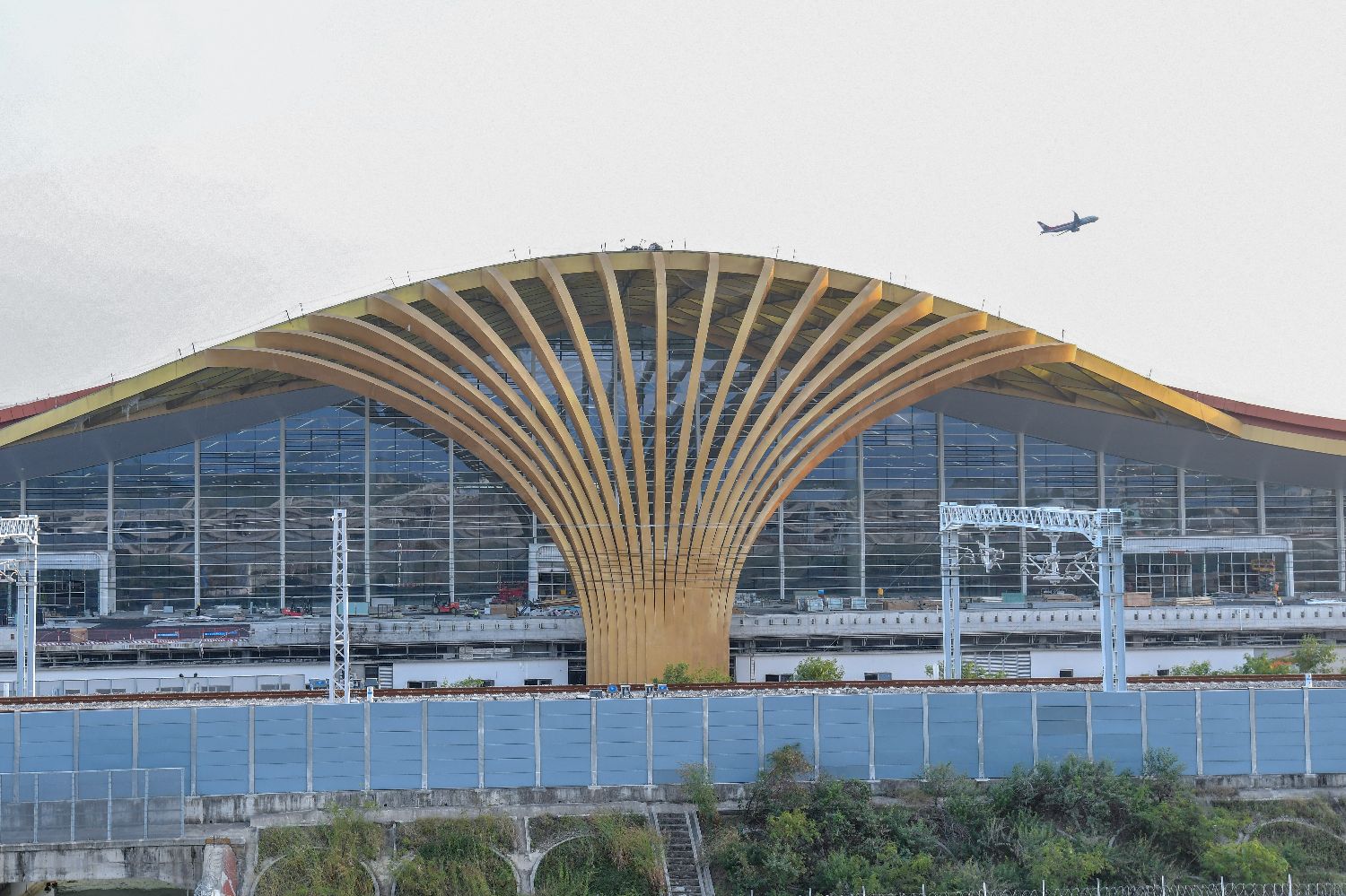 11月25日,一架飞机飞过三亚凤凰国际机场三期改扩建项目T3航站楼上空。中新社