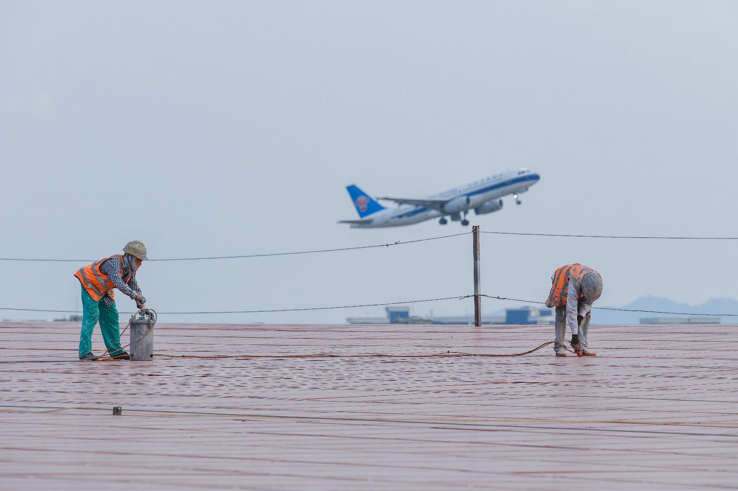 11月25日,工作人员在T3航站楼进行金属屋面收尾工作。中新社