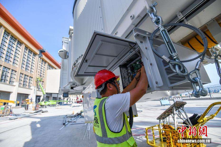 11月25日,工作人员在T3航站楼进行登机桥活动端调试。中新网