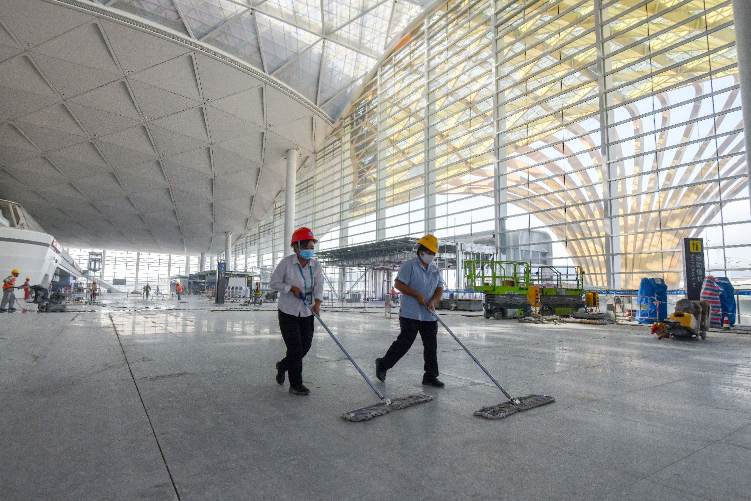 11月25日,工作人员在T3航站楼进行地面保洁工作。中新社