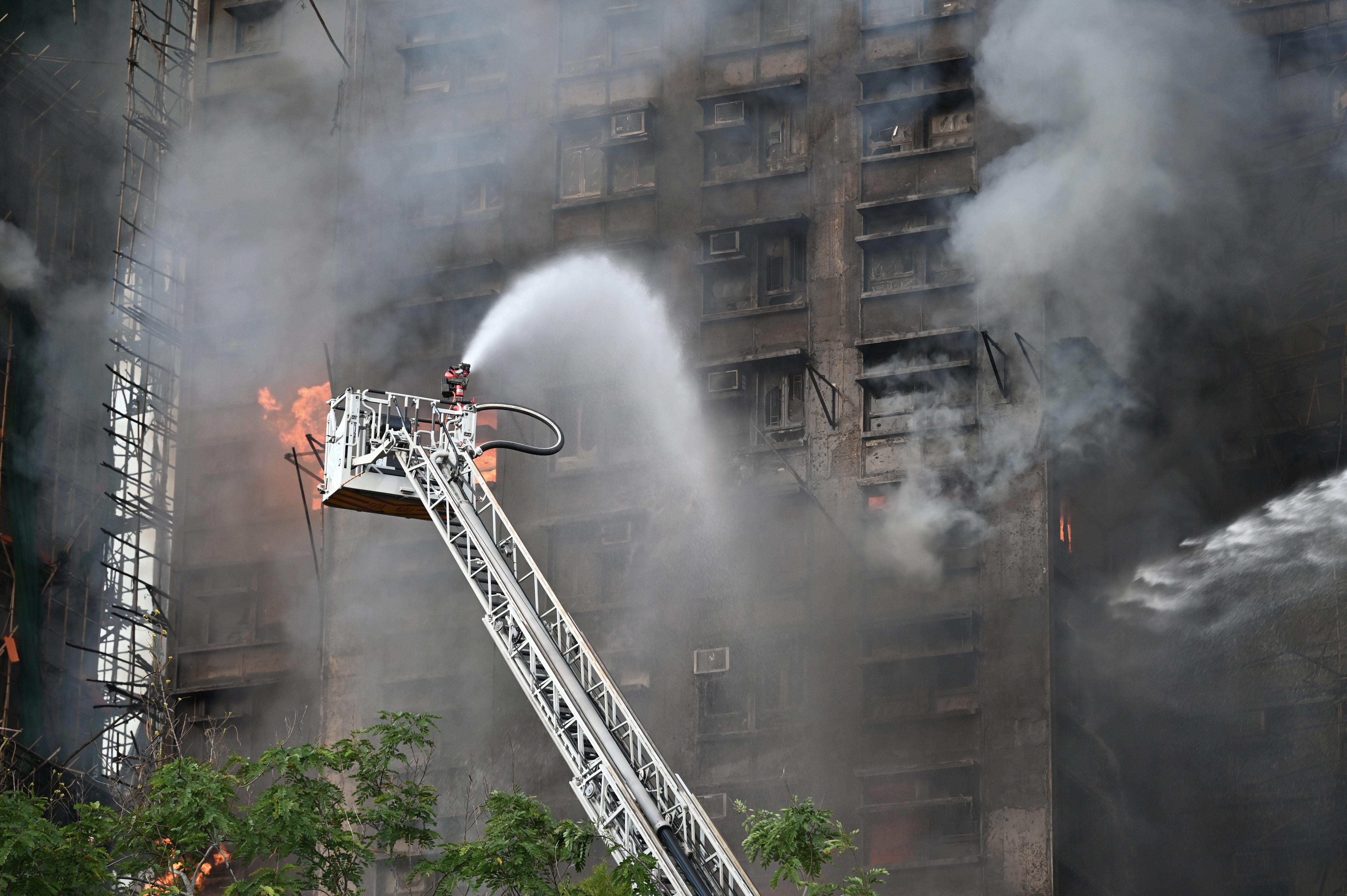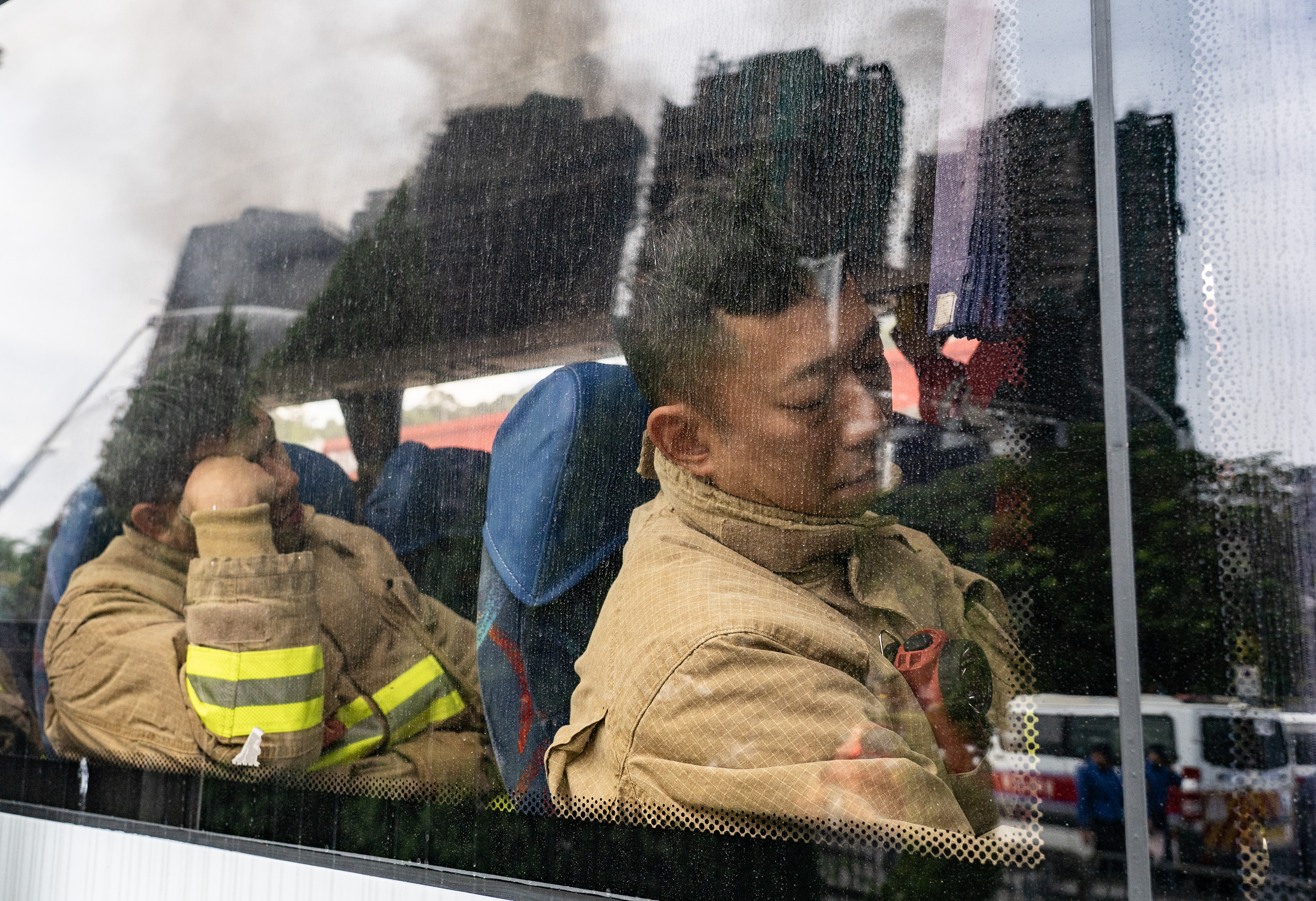 香港大埔宏福苑于北京时间11月26日下午发生火灾事故,造成重大人员伤亡。大埔宏福苑火警于26日下午6时22分升为五级。香港各方紧张救援,各界人士伸出援手。图为11月26日,火灾现场。中新社