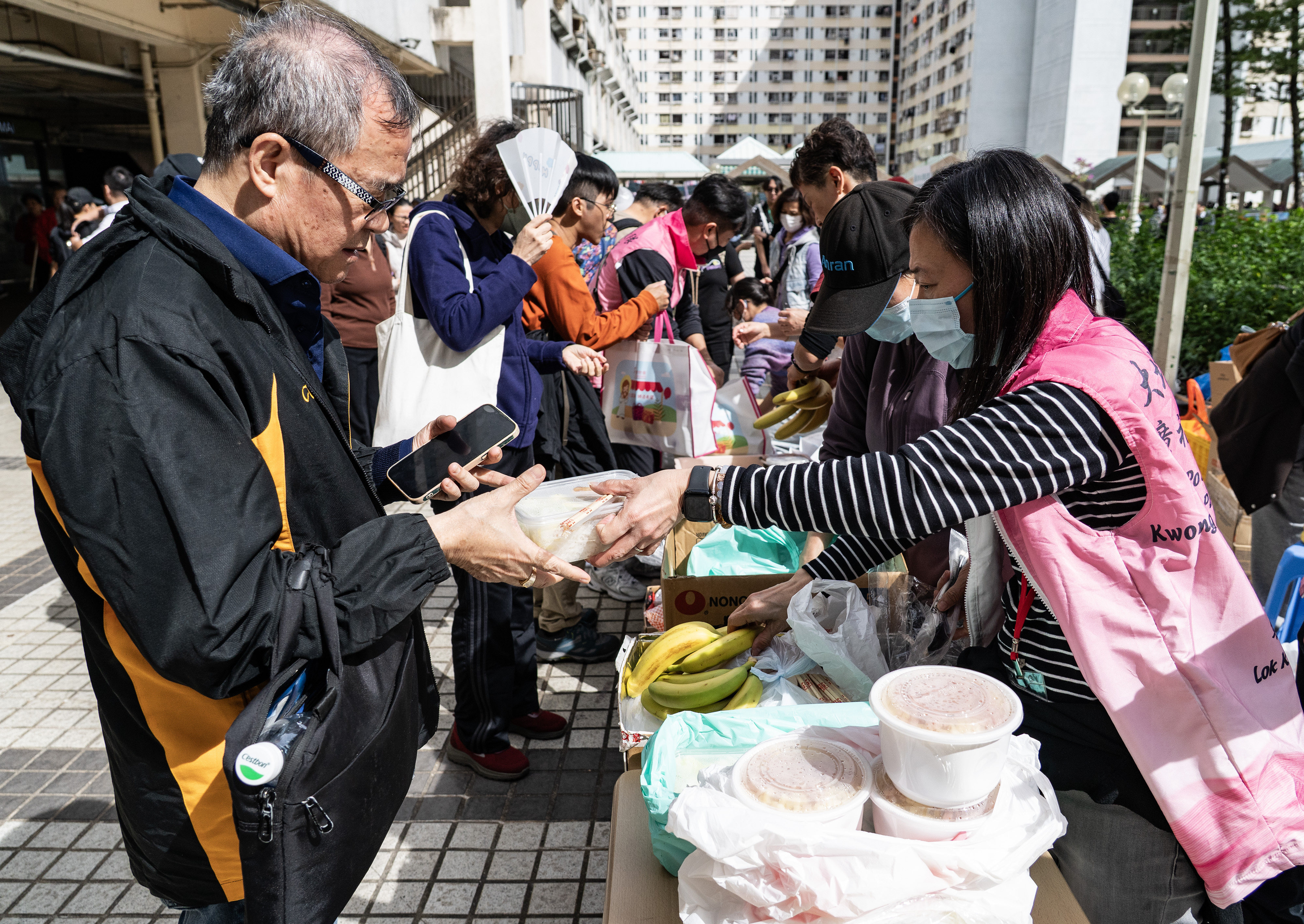 11月27日,香港大埔宏福苑火灾事故发生翌日,社区关爱队、热心市民等各界人士在事故现场附近为需要帮助的市民提供关爱协助。图为宏福苑附近的广福邨公众活动平台上,社区关爱队和热心市民等为有需要者分发餐食。中新社