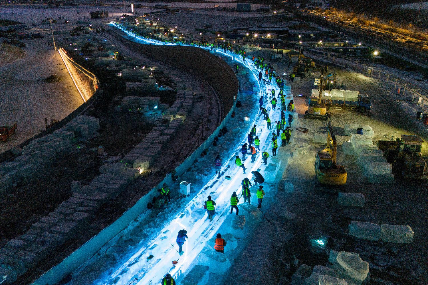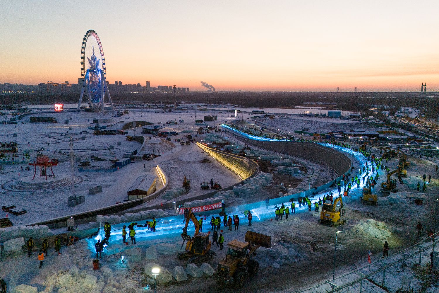 今年黑龙江哈尔滨冰雪大世界将在超级冰滑梯中融入万里长城的城墙和烽火台元素,让超级冰滑梯的“速度与激情”与万里长城的“雄关漫道”深度融合,尽显北国冰雪的雄浑之美。目前,哈尔滨冰雪大世界园区里,吊装、运输、切割设备轰鸣作业,工程车辆往来穿梭,陆续将有近万名建设人员投入各项建设工作中。图为11月27日,冰雪大世界超级冰滑梯在建设中。(无人机照片)中新网