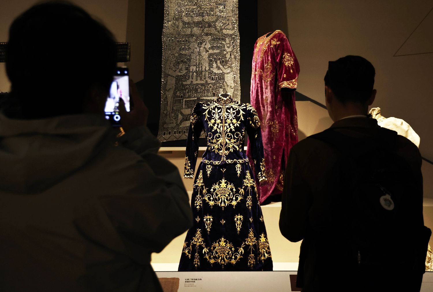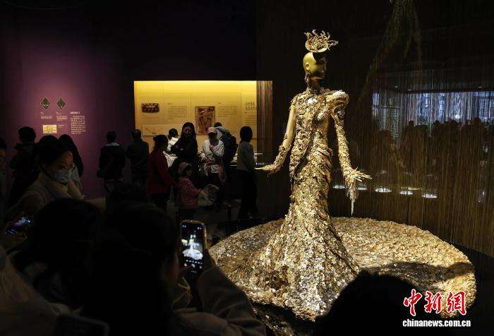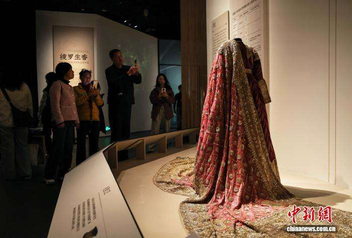 11月30日,“金线——从北非到东亚的黄金服饰风尚”特展在四川成都博物馆正式面向公众开放。本次展览以“金线”为脉络,汇集了200余件/套织金珍品,以及中国丝绸博物馆等8家文博机构的珍贵藏品。图为参观者观看展出的埃及婚礼服饰。中新社