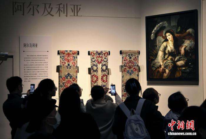 参观者观看展出的阿尔及利亚花卉刺绣。中新网