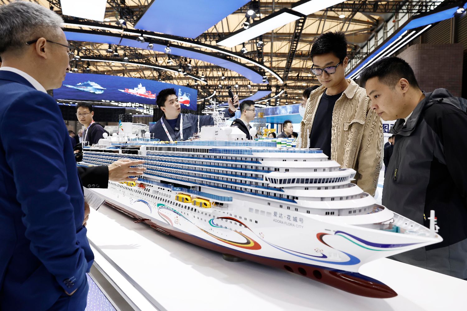 12月2日,观众在中国第二艘国产大型邮轮“爱达·花城号”模型前了解相关信息。中新社