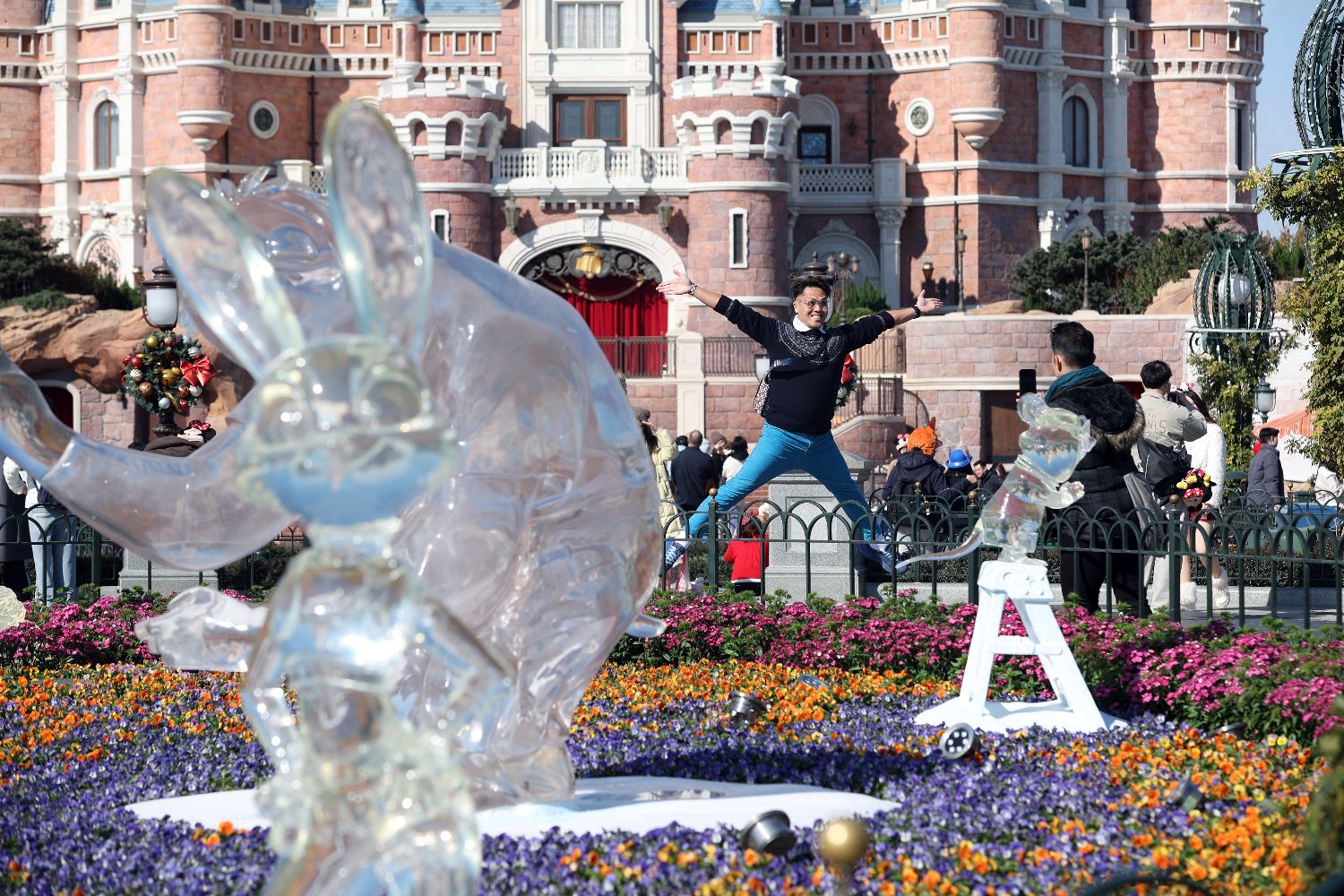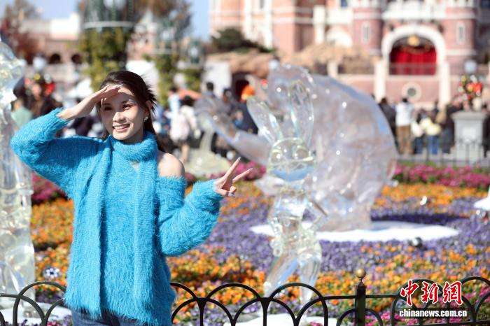 12月4日,游客在上海迪士尼乐园和冰雕合影。中新网