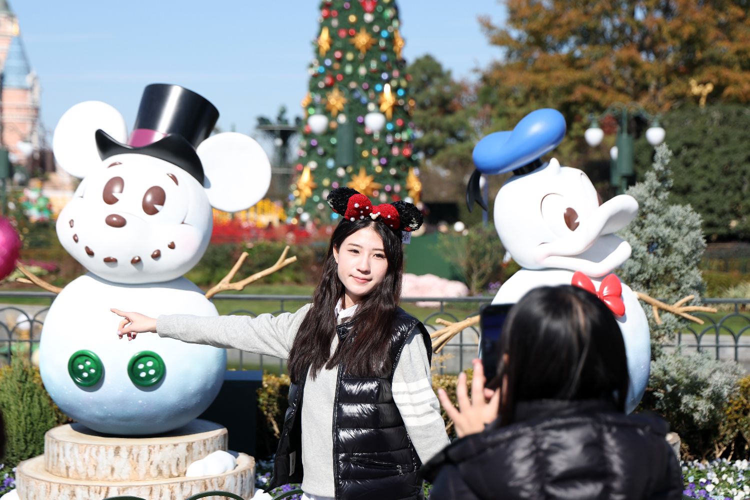 12月4日,外国游客在上海迪士尼乐园拍照留念。中新网