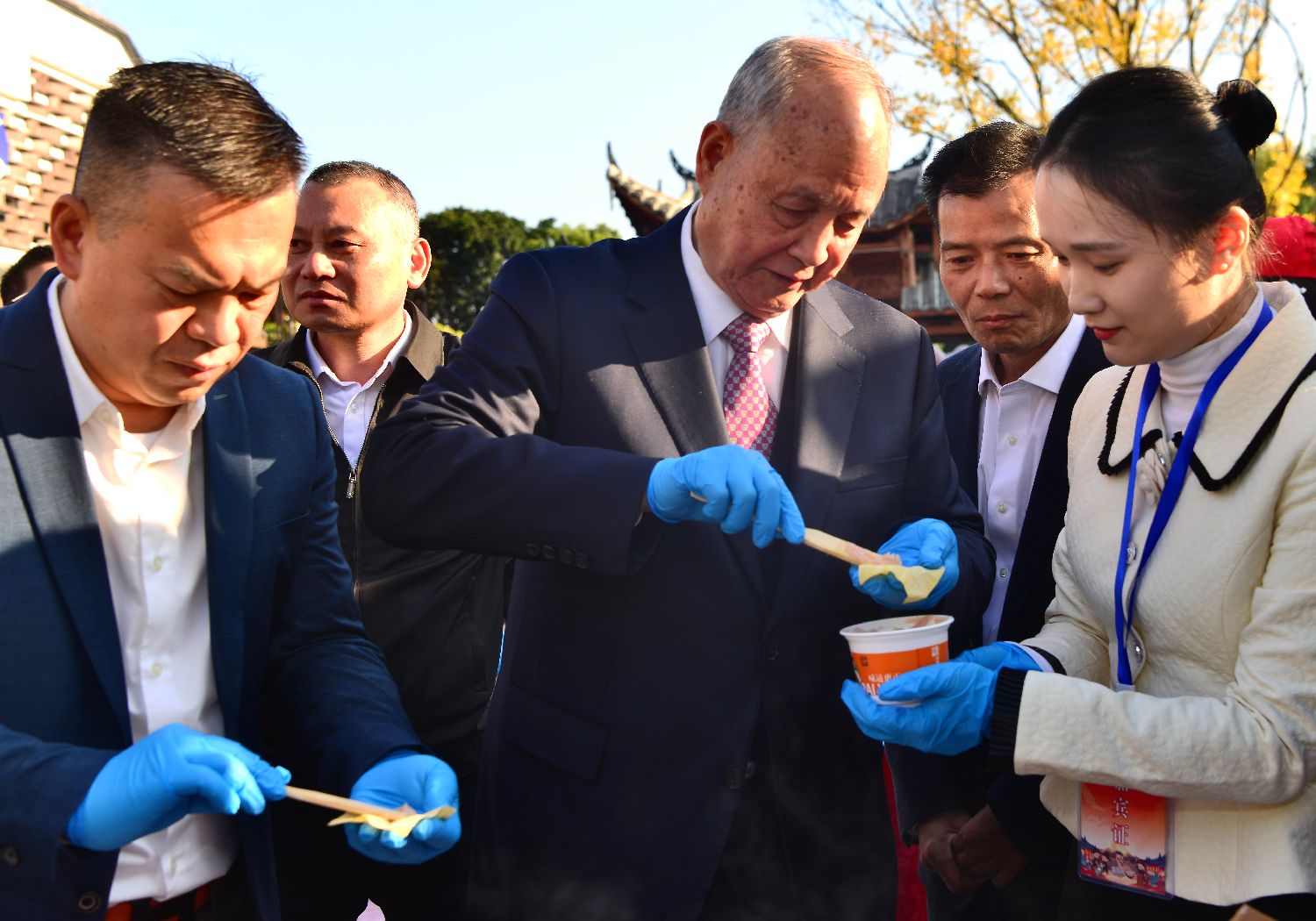 台湾中华民族发展基金会董事长、海基会原董事长林中森在活动上体验包扁肉。中新社