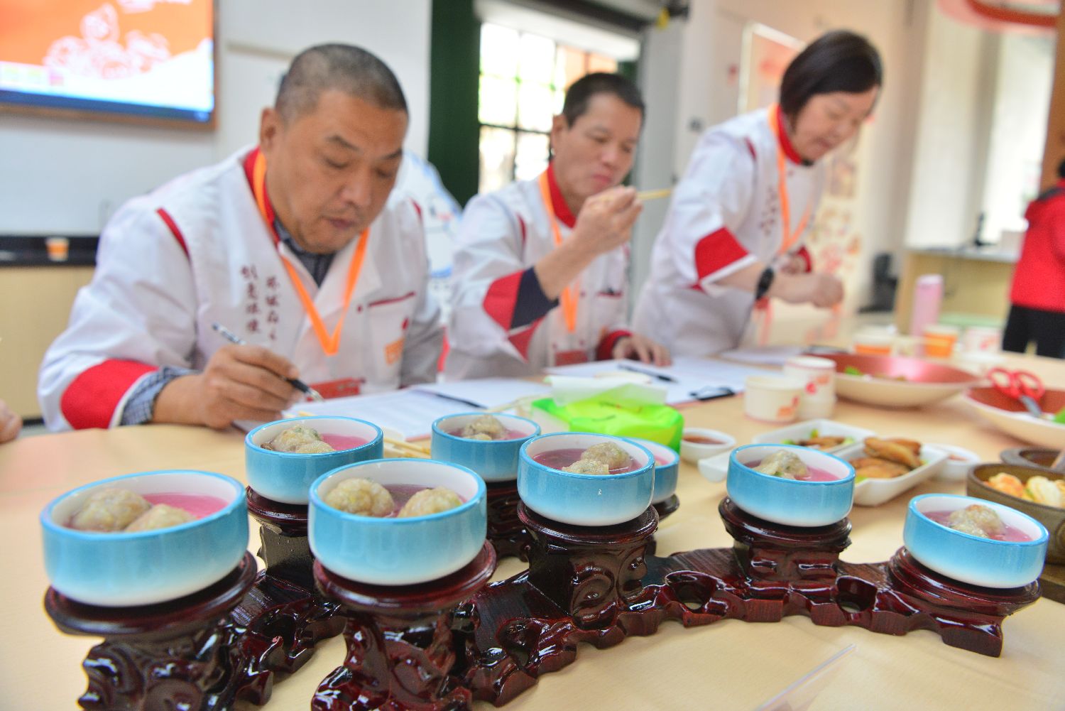 评委品尝菜品并打分。中新社