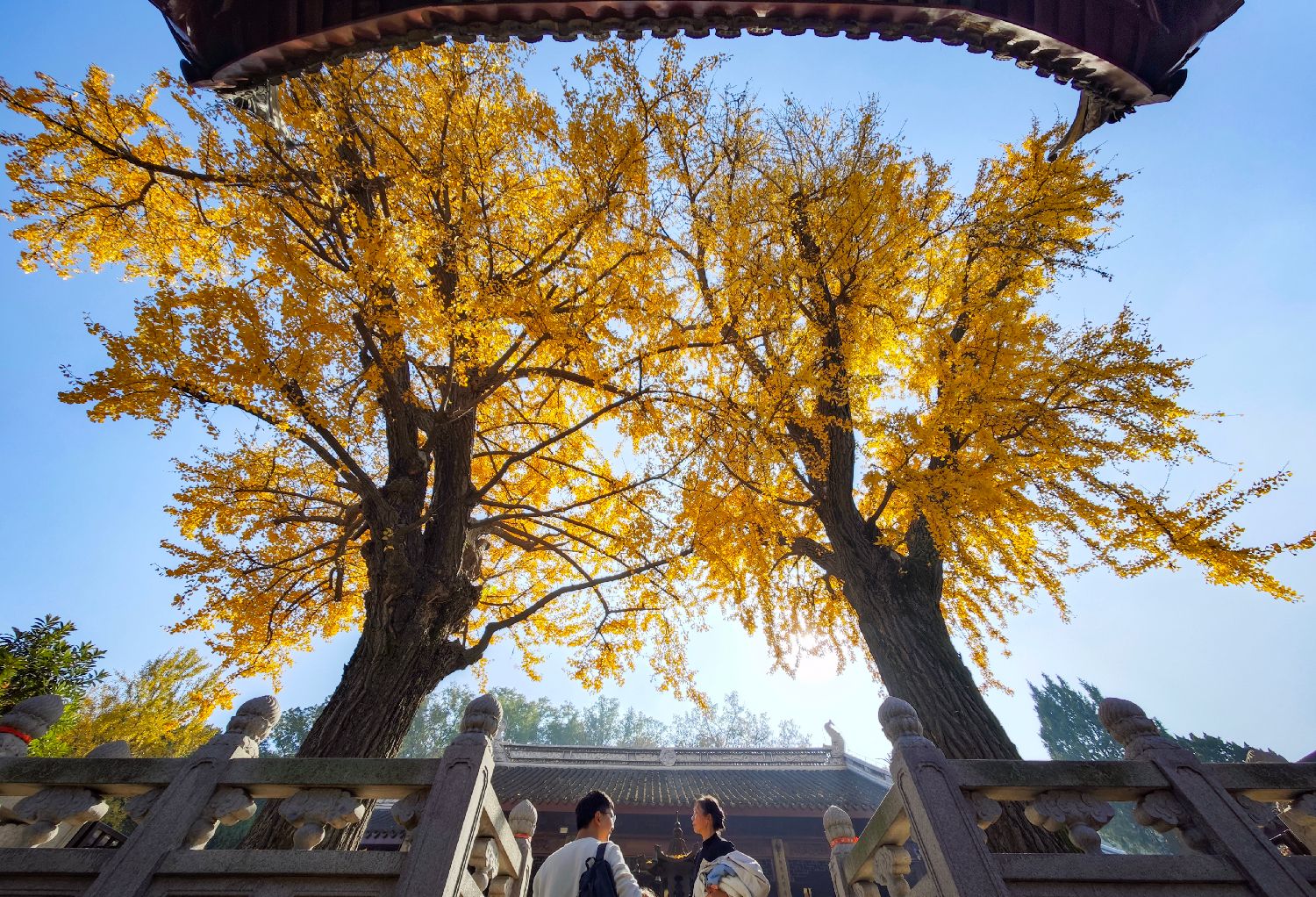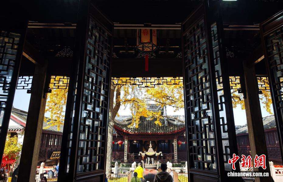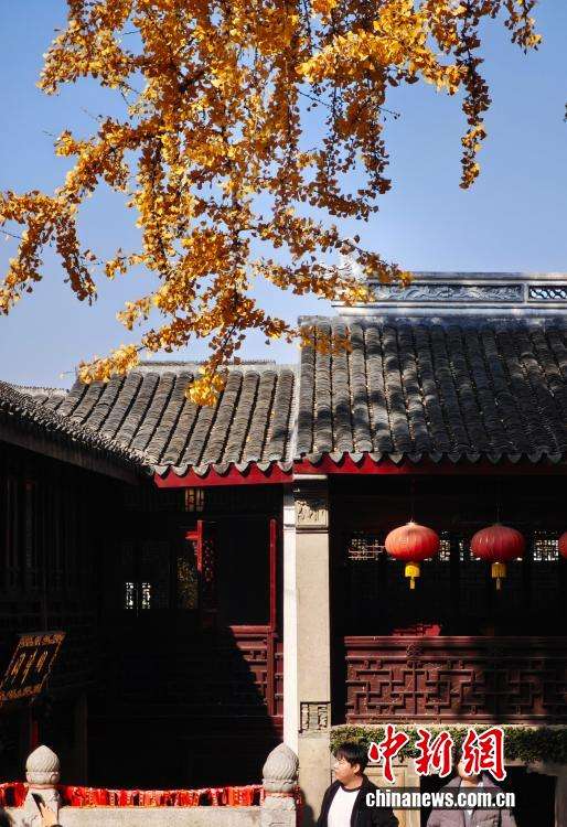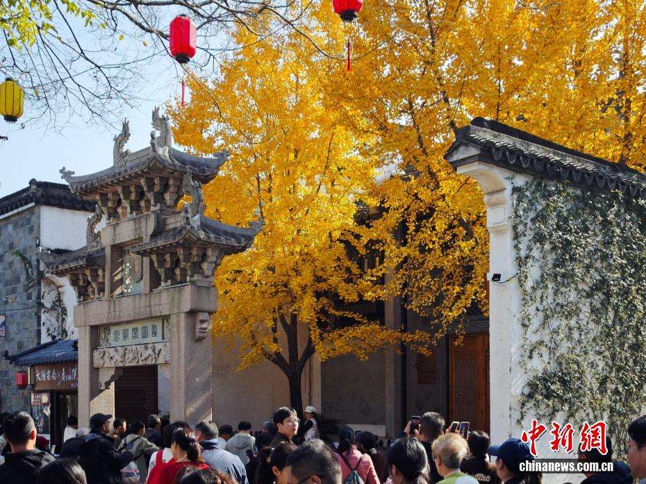 12月7日,游客在惠山古镇银杏树下参观。中新网