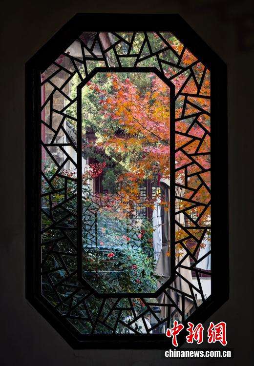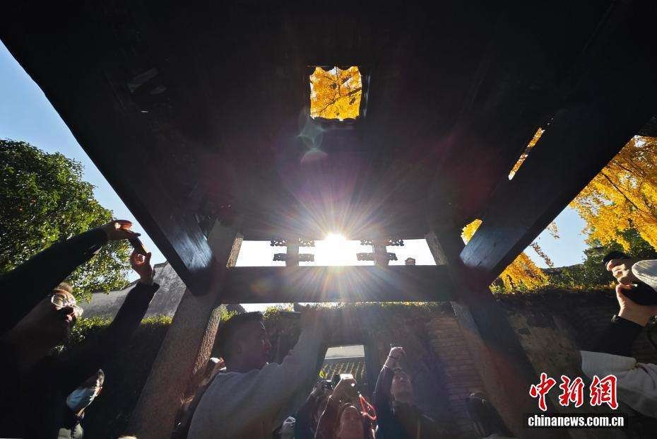 12月7日,游客在惠山古镇透过房顶拍摄银杏。中新网