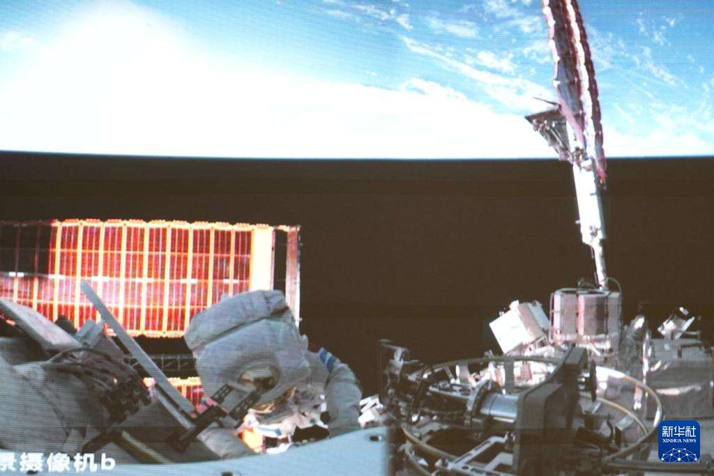 这是12月9日在北京航天飞行控制中心屏幕上拍摄的神舟二十一号乘组航天员张陆与武飞(右)在舱外工作的画面。