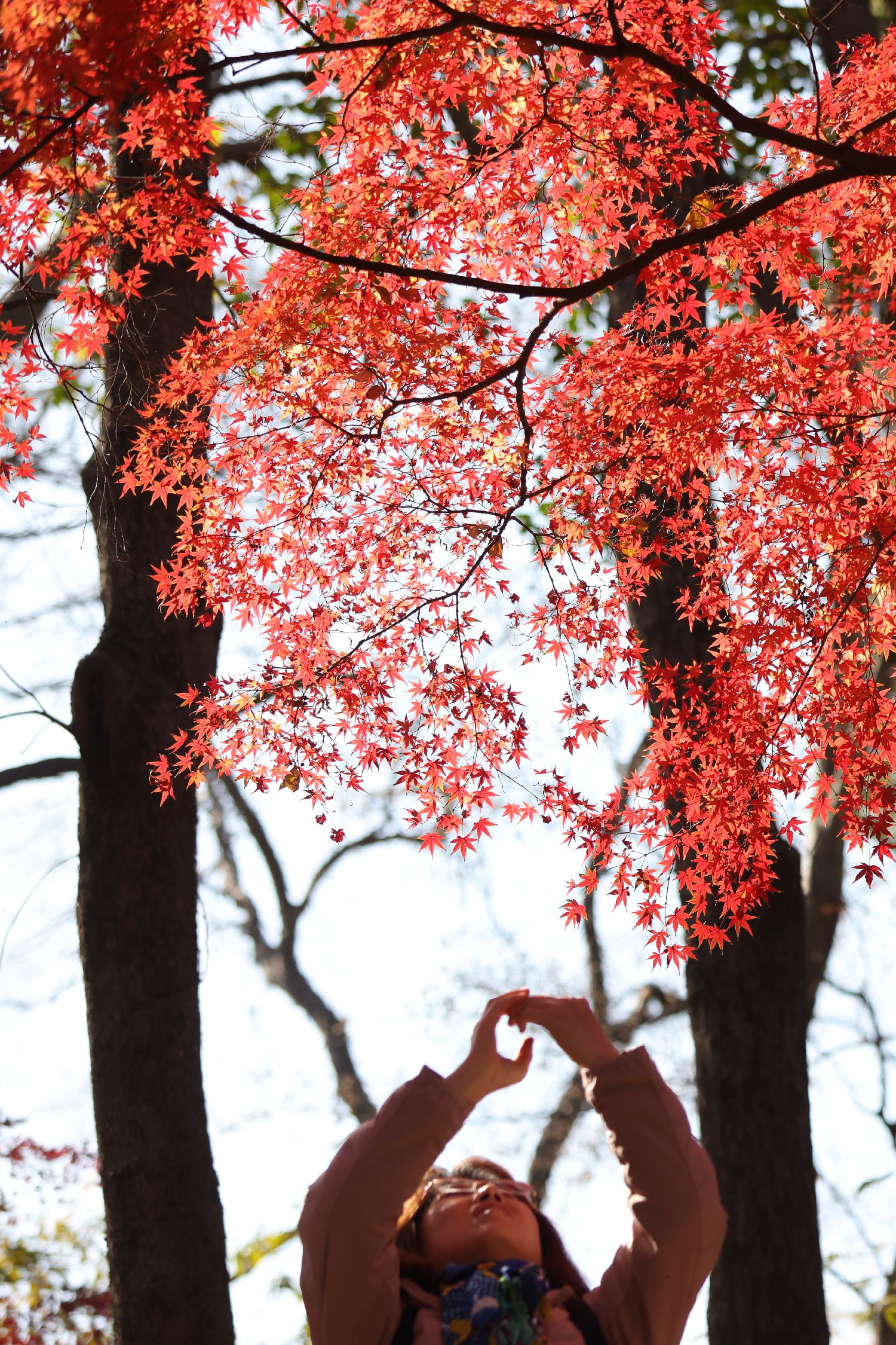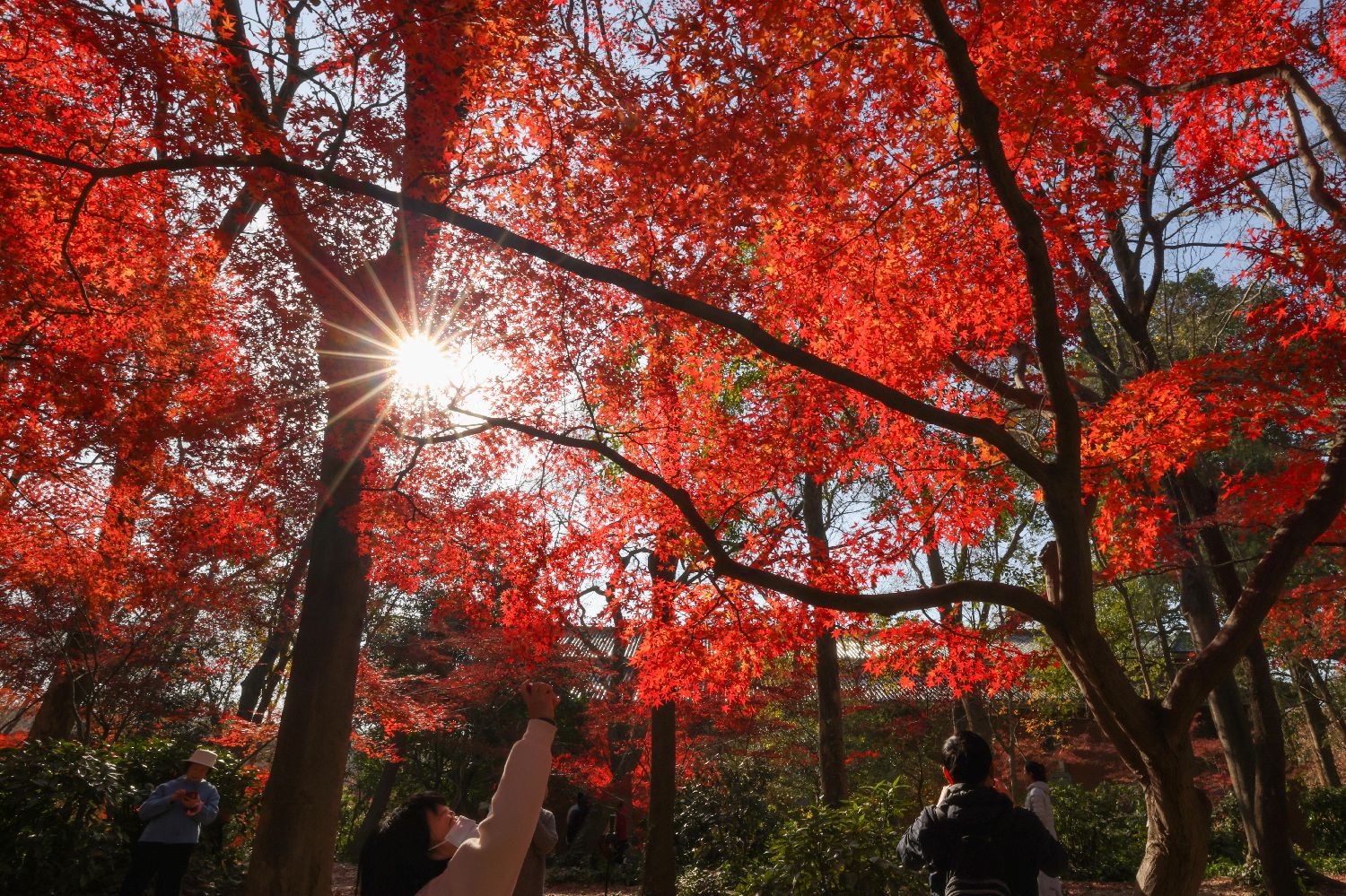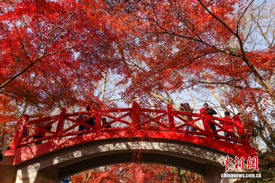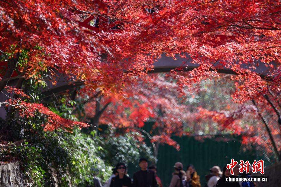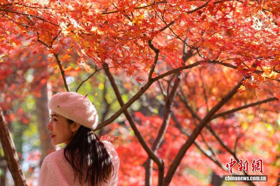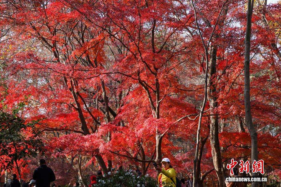 近日,江苏南京的紫金山红枫岗上枝叶层叠,红红火火的树叶在光照下熠熠生辉,吸引民众前往欣赏唯美“枫”景。图为12月9日,民众在唯美“枫”景下留影。中新社