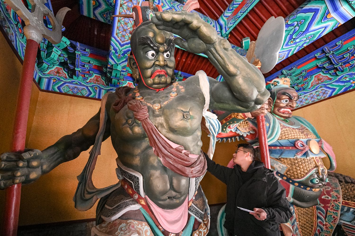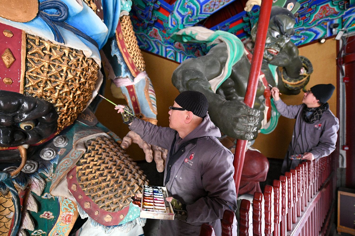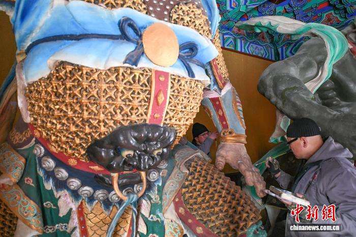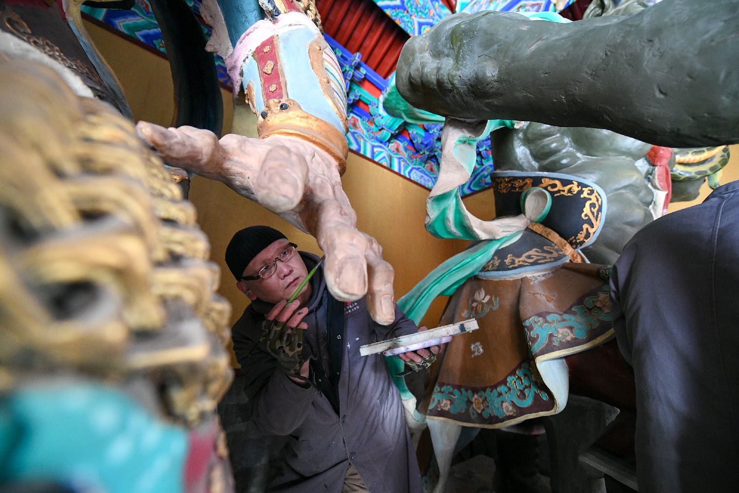 12月10日,来自中国国家级非物质文化遗产代表性项目天津泥人张彩塑工作室的工艺美术师们为殿宇内的塑像进行修复。中新网