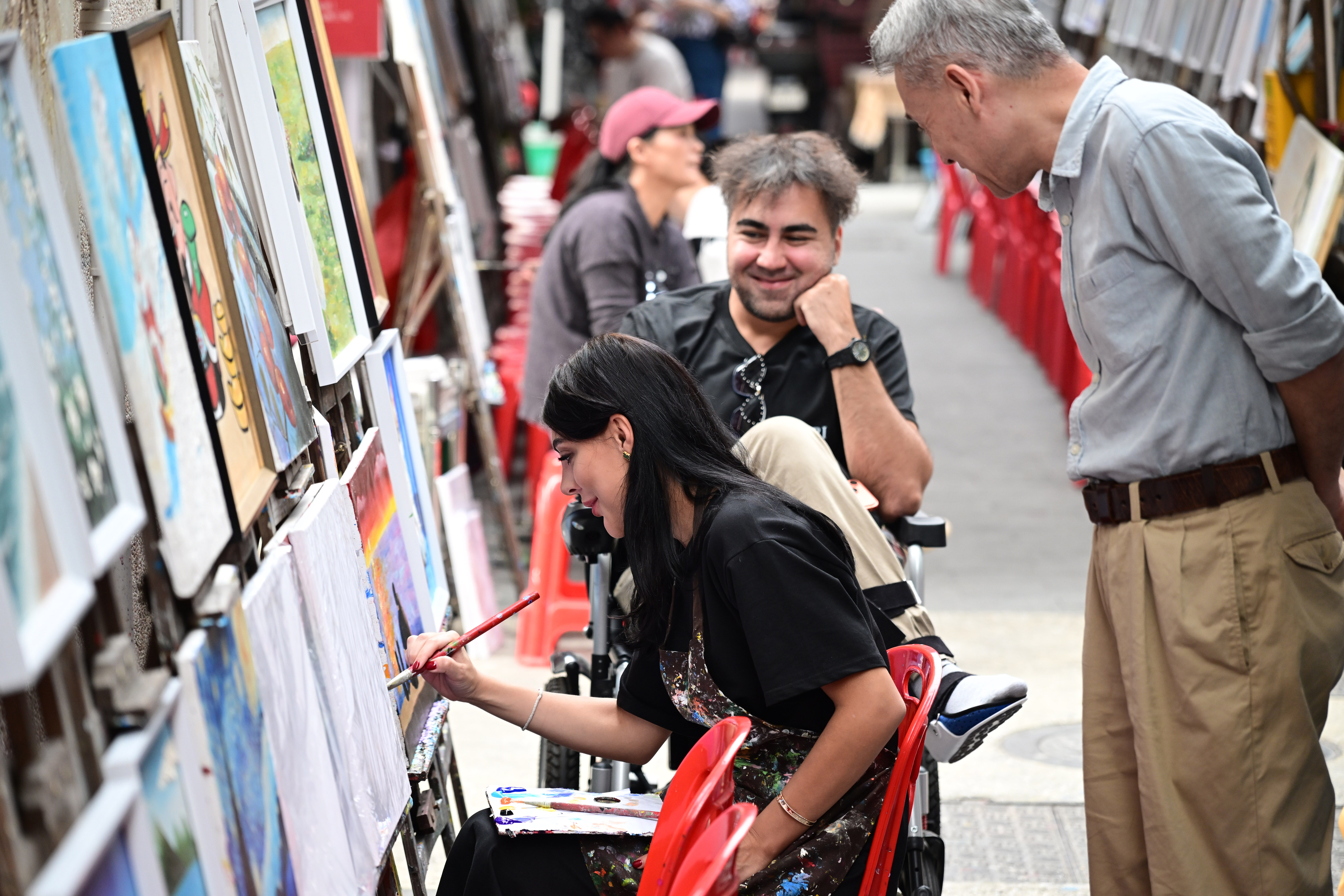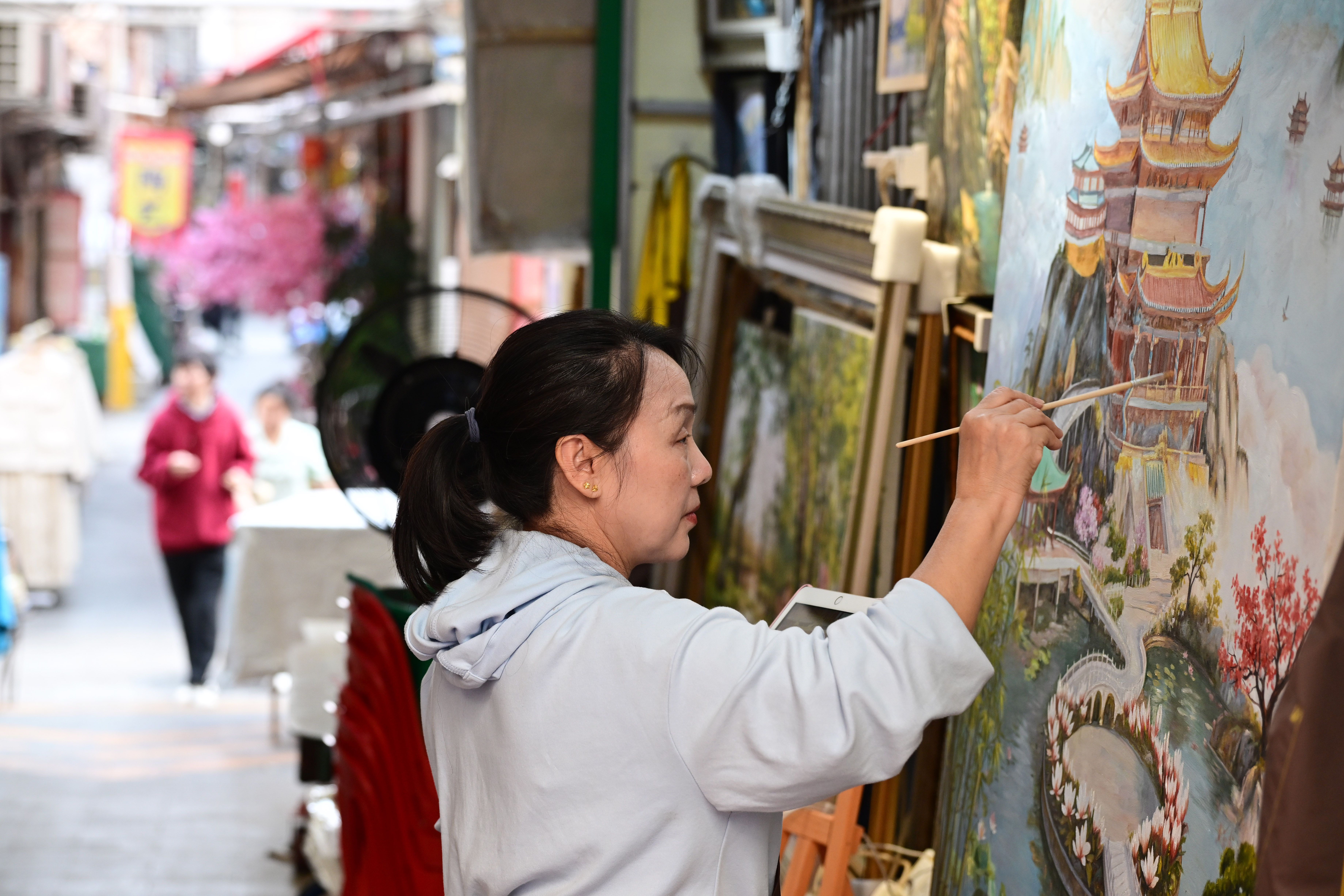 大芬油画村位于广东省深圳市龙岗区布吉街道大芬社区,是中国最大的商品油画生产、交易基地之一,有着“中国油画第一村”之称。目前村内共有大小画廊及门店1200余家,村内聚集油画从业人员约8000人。图为12月11日,游客在大芬油画村体验画油画。中新社