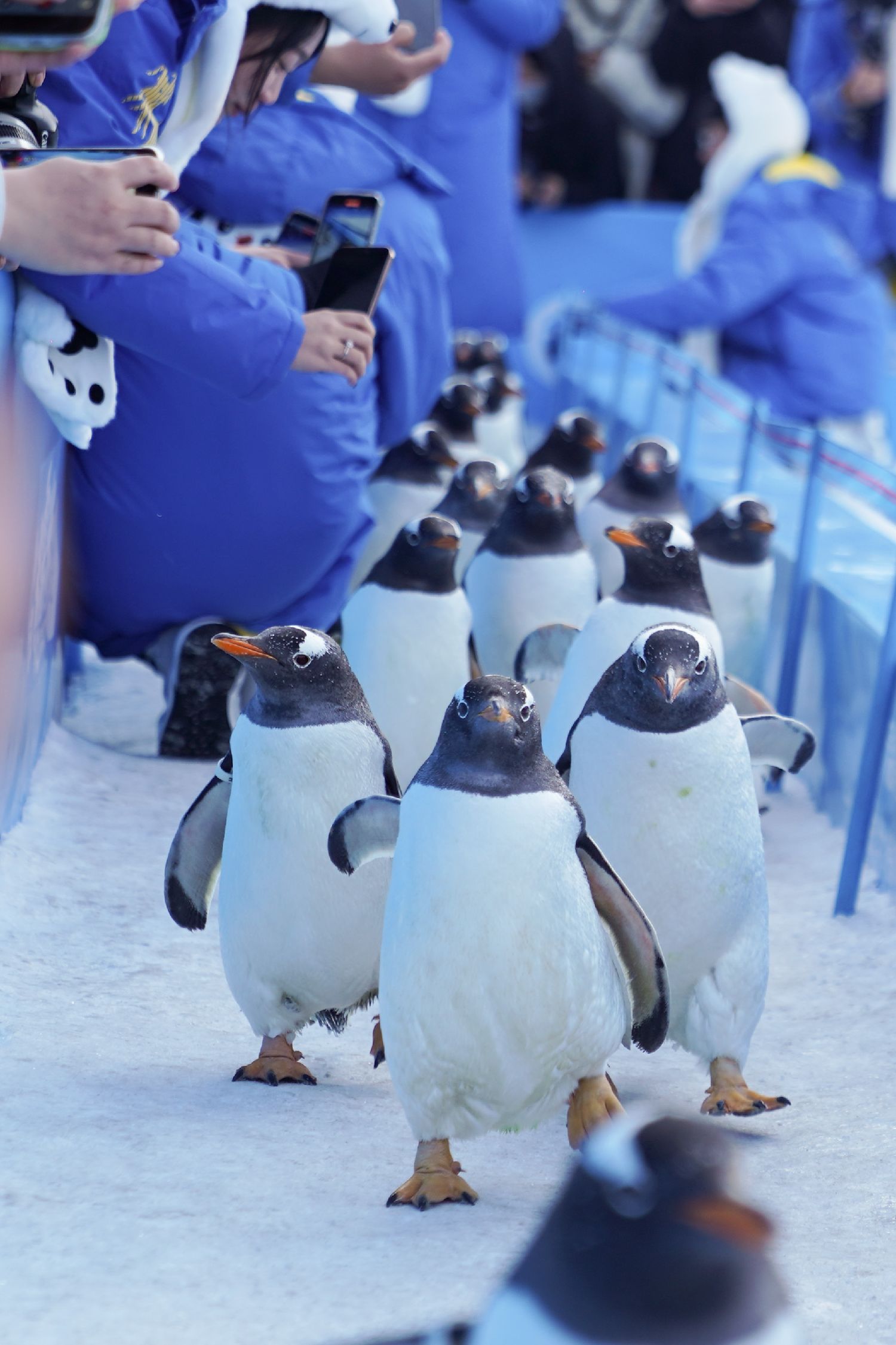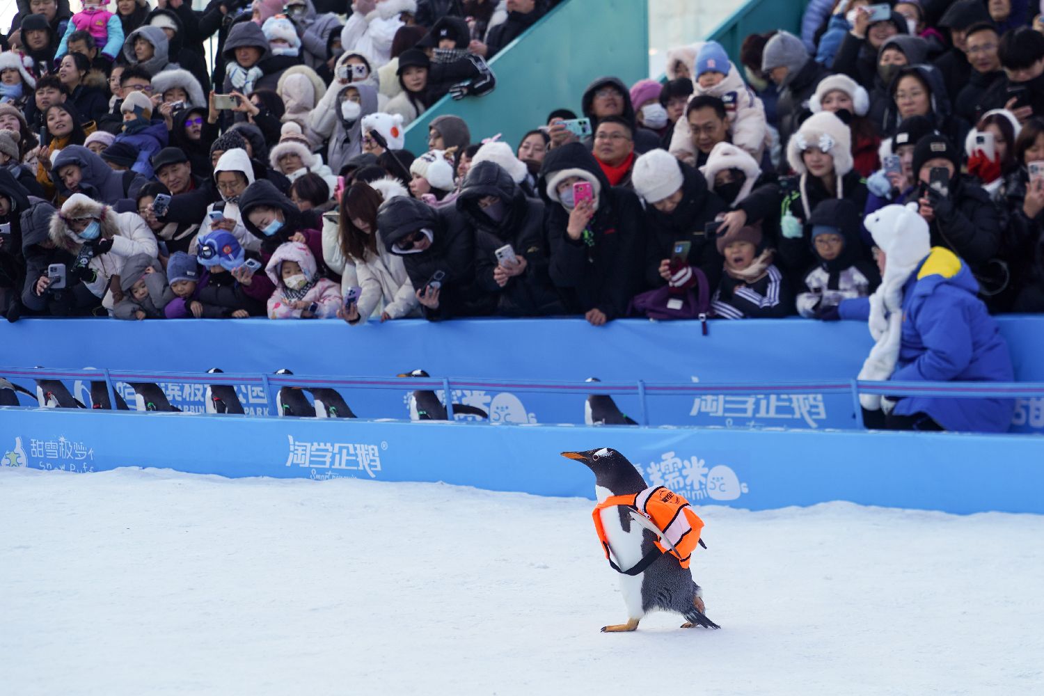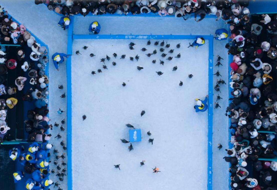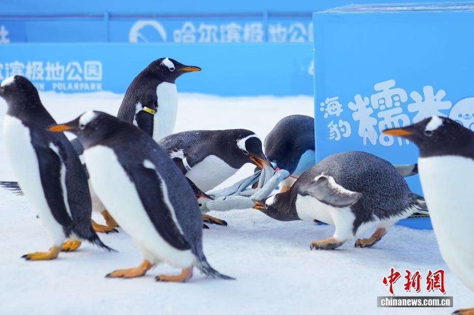 12月13日,人们在哈尔滨极地公园观看企鹅巡游。新华社