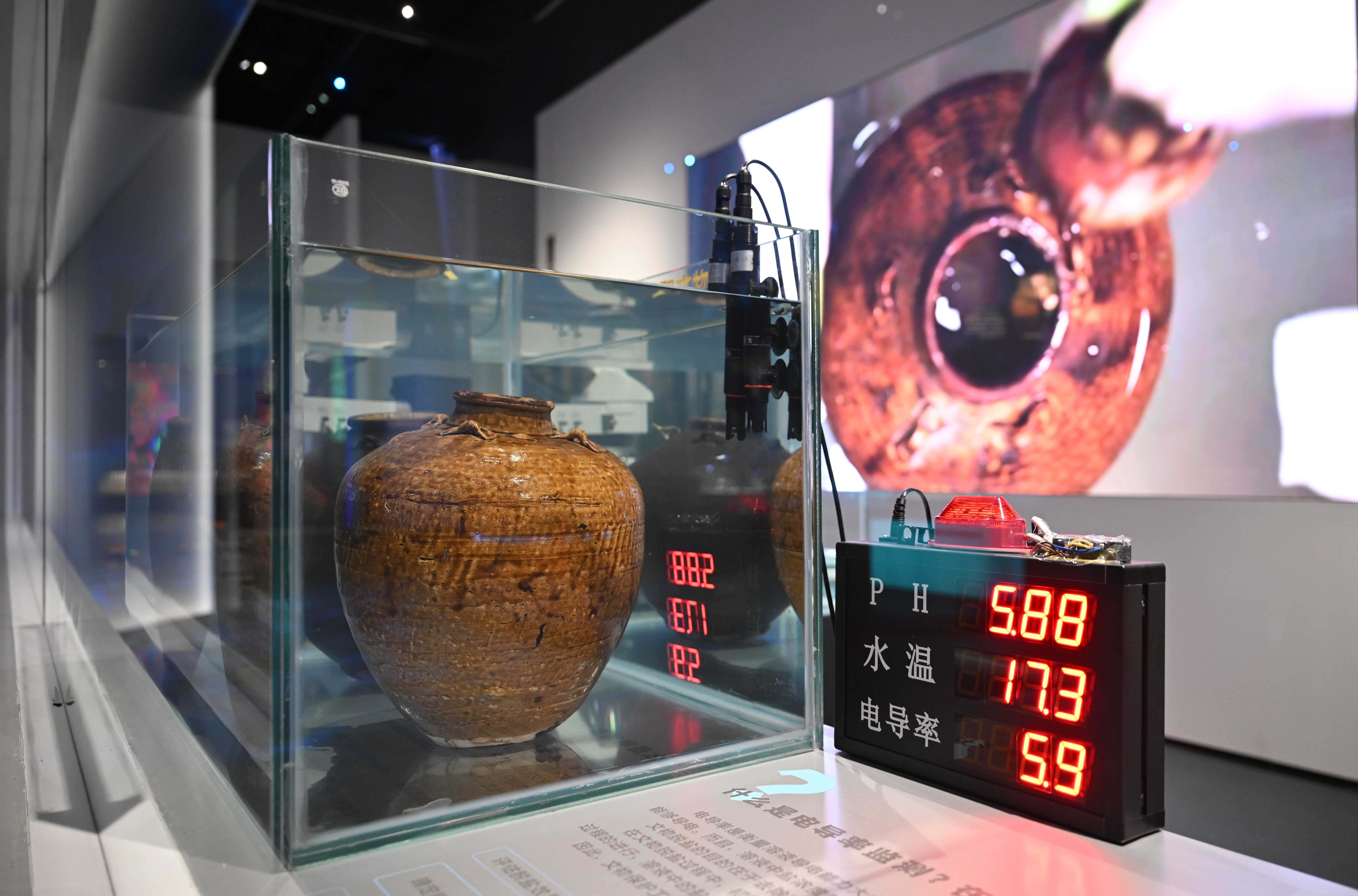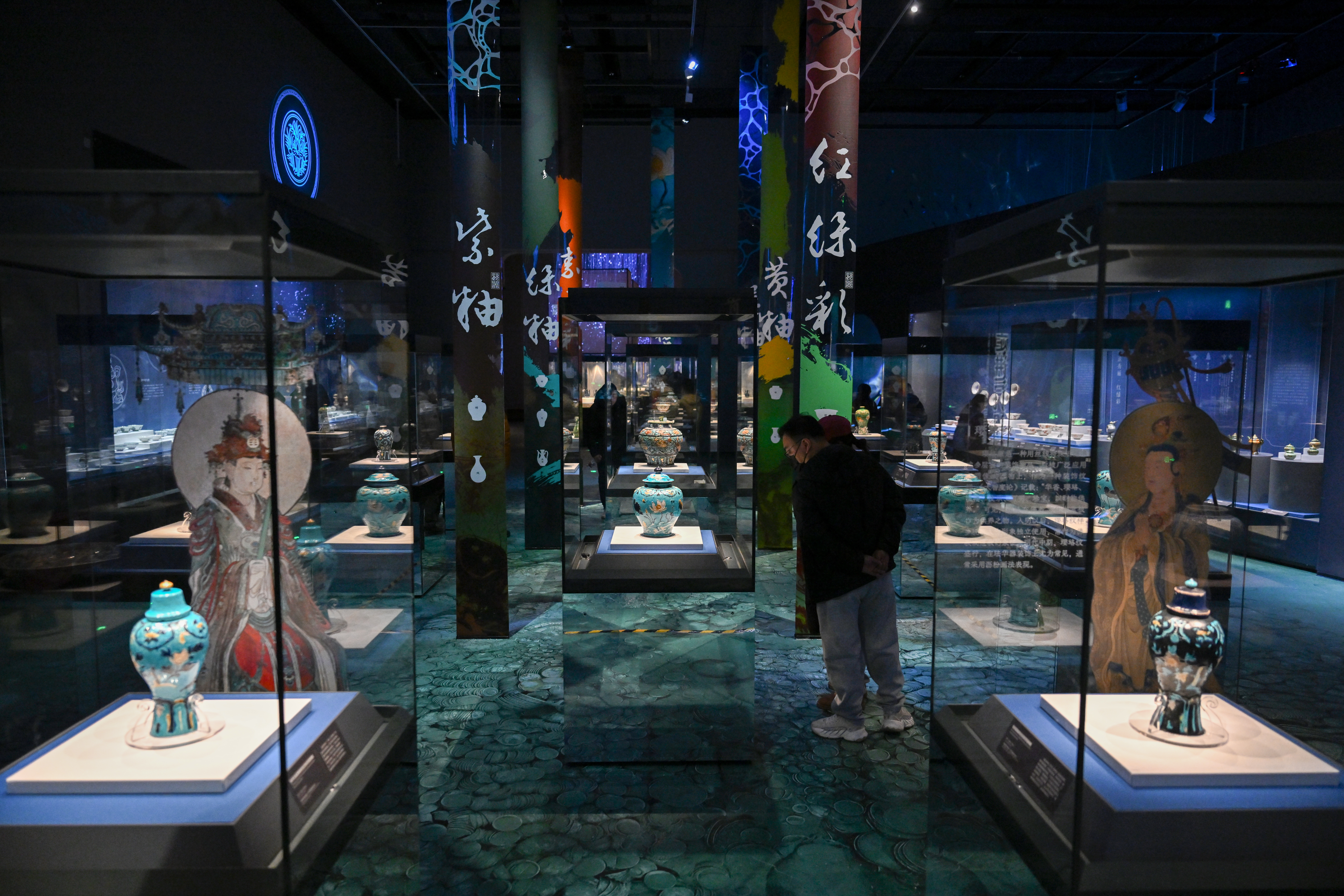 12月16日,“向海而行——中国南海西北陆坡海域深海考古特展”在北京大运河博物馆开幕,377组件文物亮相。据悉,南海西北陆坡一号、二号沉船发现于2022年10月,位于海南岛与西沙群岛之间的南海海底,遗址水深约1500米。两艘沉船其年代分别属于明朝正德、弘治年间。遗址保存相对完好,文物数量巨大,时代比较明确,具有极高的历史、科学及艺术价值。图为展览现场。中新社