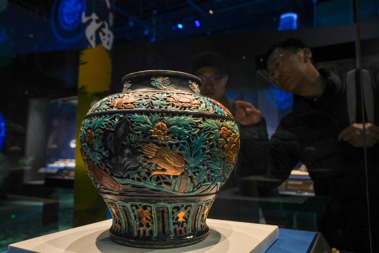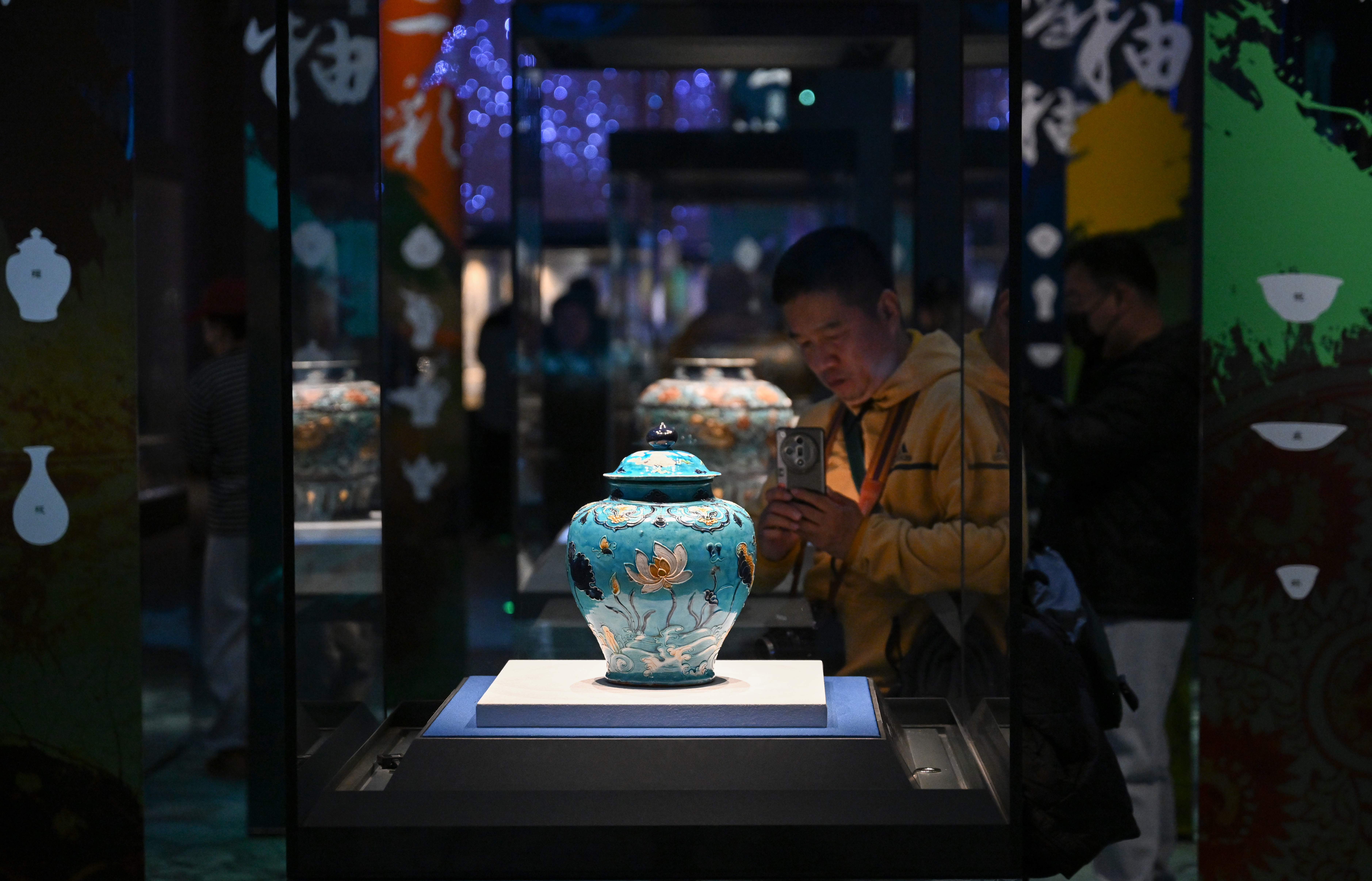 展出“珐华孔雀绿釉莲池纹盖罐”吸引参观者。中新社