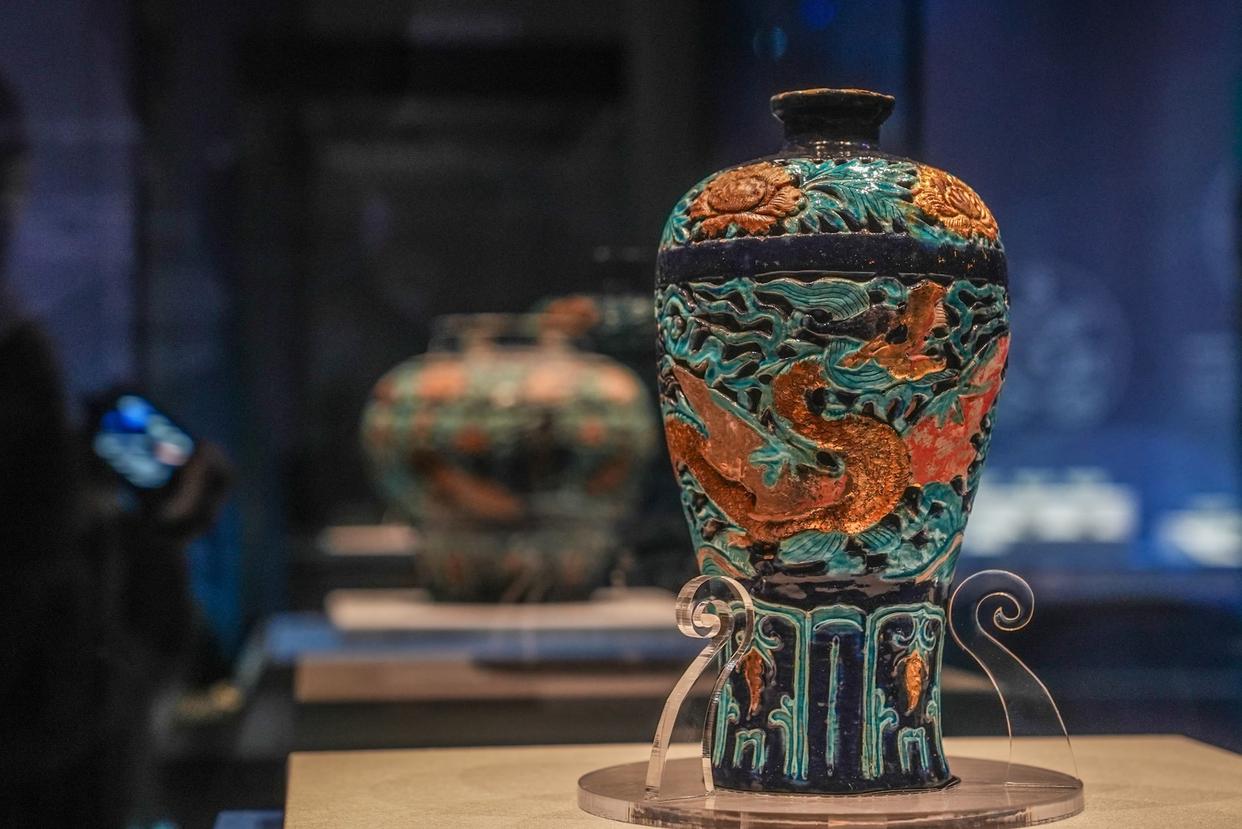 珐华贴金镂空应龙云海纹梅瓶。北京日报客户端
