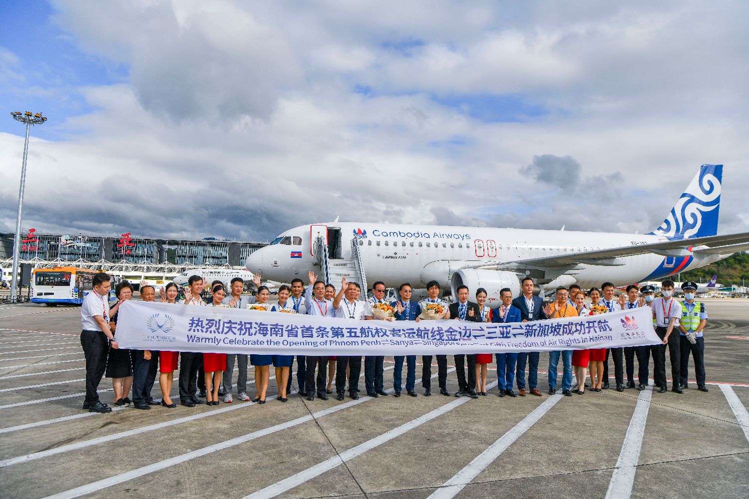 资料图为2023年12月1日,由柬埔寨航空执飞的KR9755航班从金边飞抵三亚,出席开航仪式的领导嘉宾与航班机组成员合影。这是海南自贸港开通的首条第五航权定期客运航线。中新社