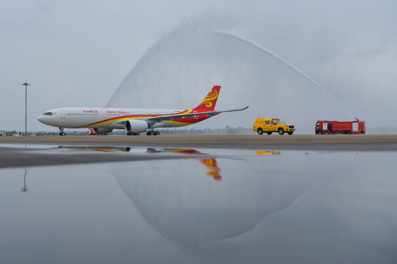 资料图为2025年11月1日,海南航空首架A330neo客机在海口美兰国际机场停机坪穿越“水门礼”。该飞机通过海南自贸港交通工具及游艇“零关税”政策享受减免税款约1.14亿元人民币,创下单票享惠数额新高。中新社