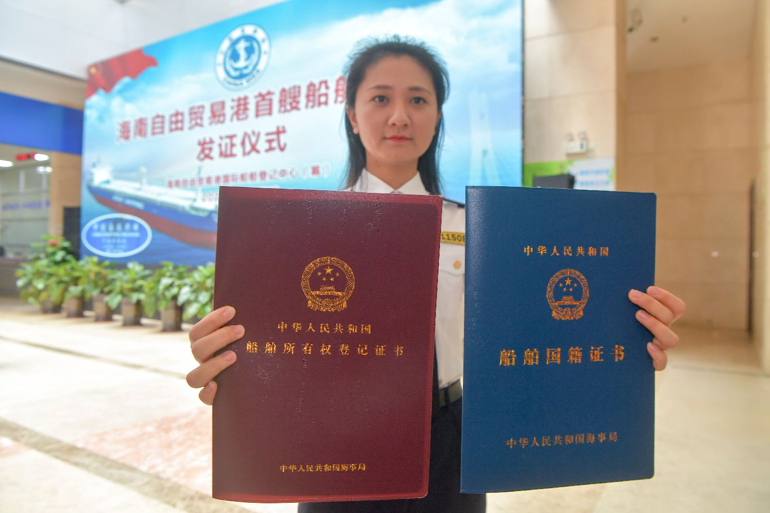 资料图为2020年6月4日,海南海事局、洋浦经济开发区管委会向“中远海运兴旺”轮颁发首张“中国洋浦港”《船舶国籍证书》,标志着船籍港为“中国洋浦港”的首艘国际登记船舶诞生,海南自贸港有关船舶登记政策正式落地实施。中新社