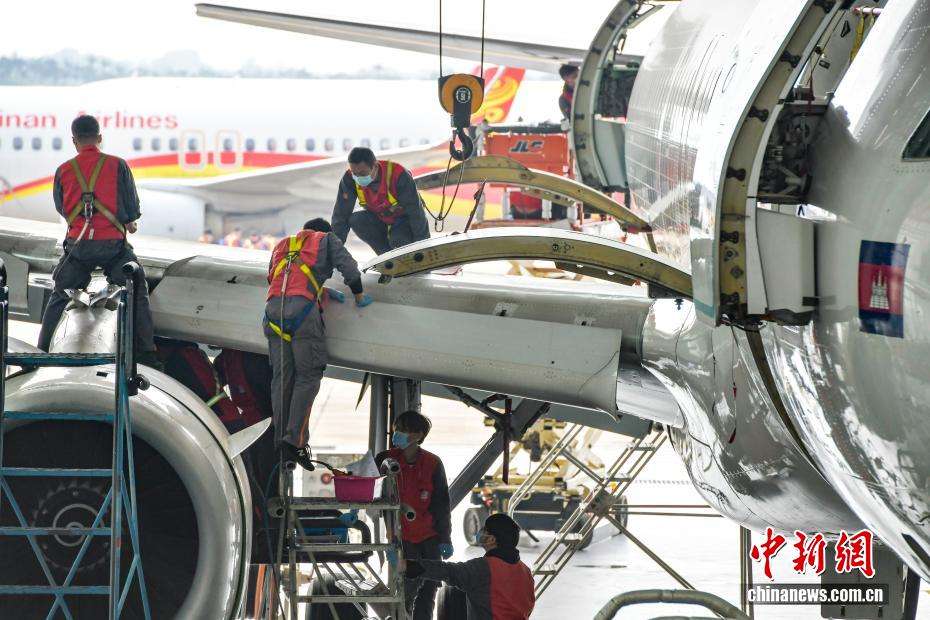 资料图为2021年1月19日,柬埔寨澜湄航空的一架空客A320飞机进行高级别定检维修工作,两天后飞返柬埔寨,这是《海南自由贸易港建设总体方案》发布以来在海南自贸港完成的首单境外飞机进境保税维修业务。中新网