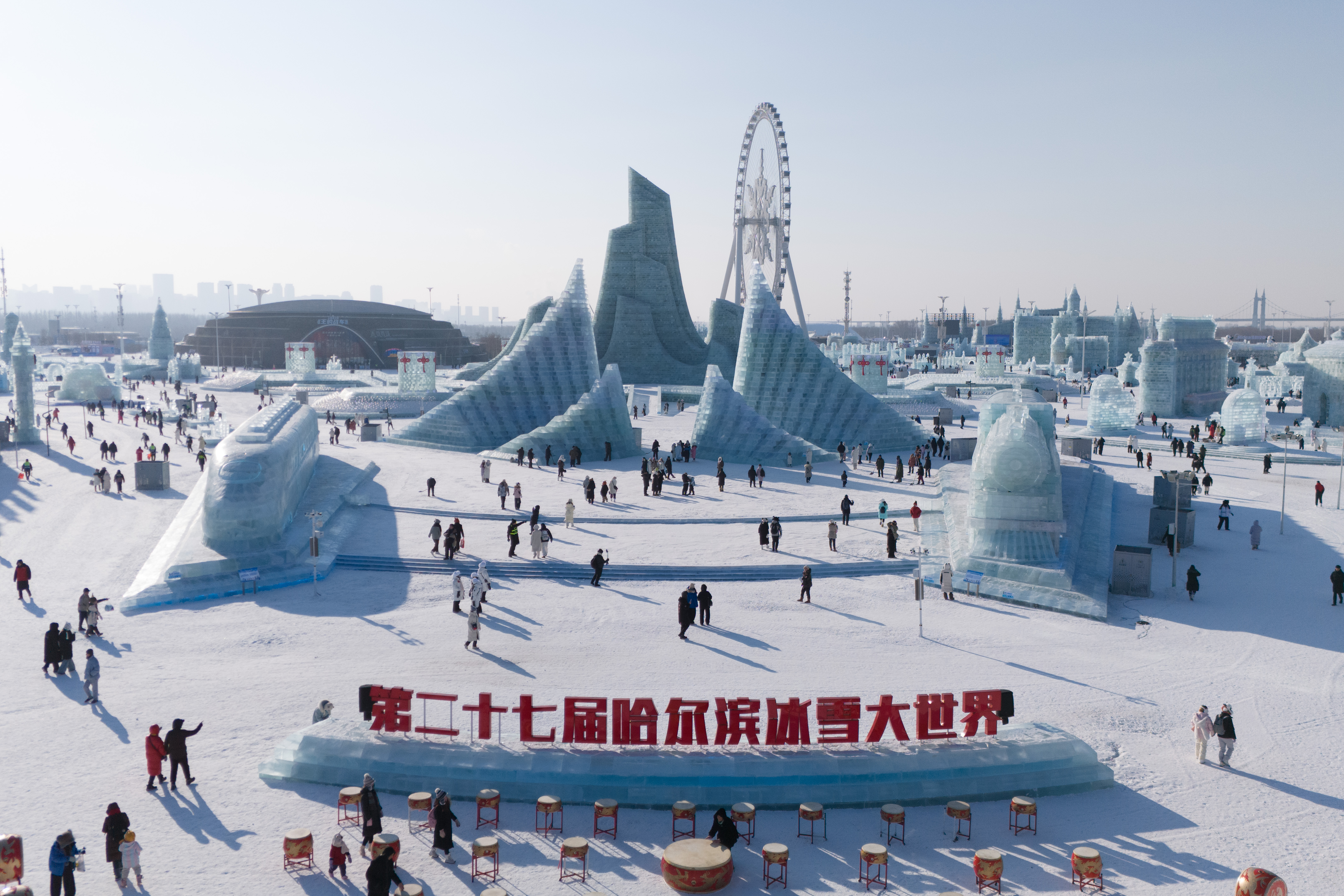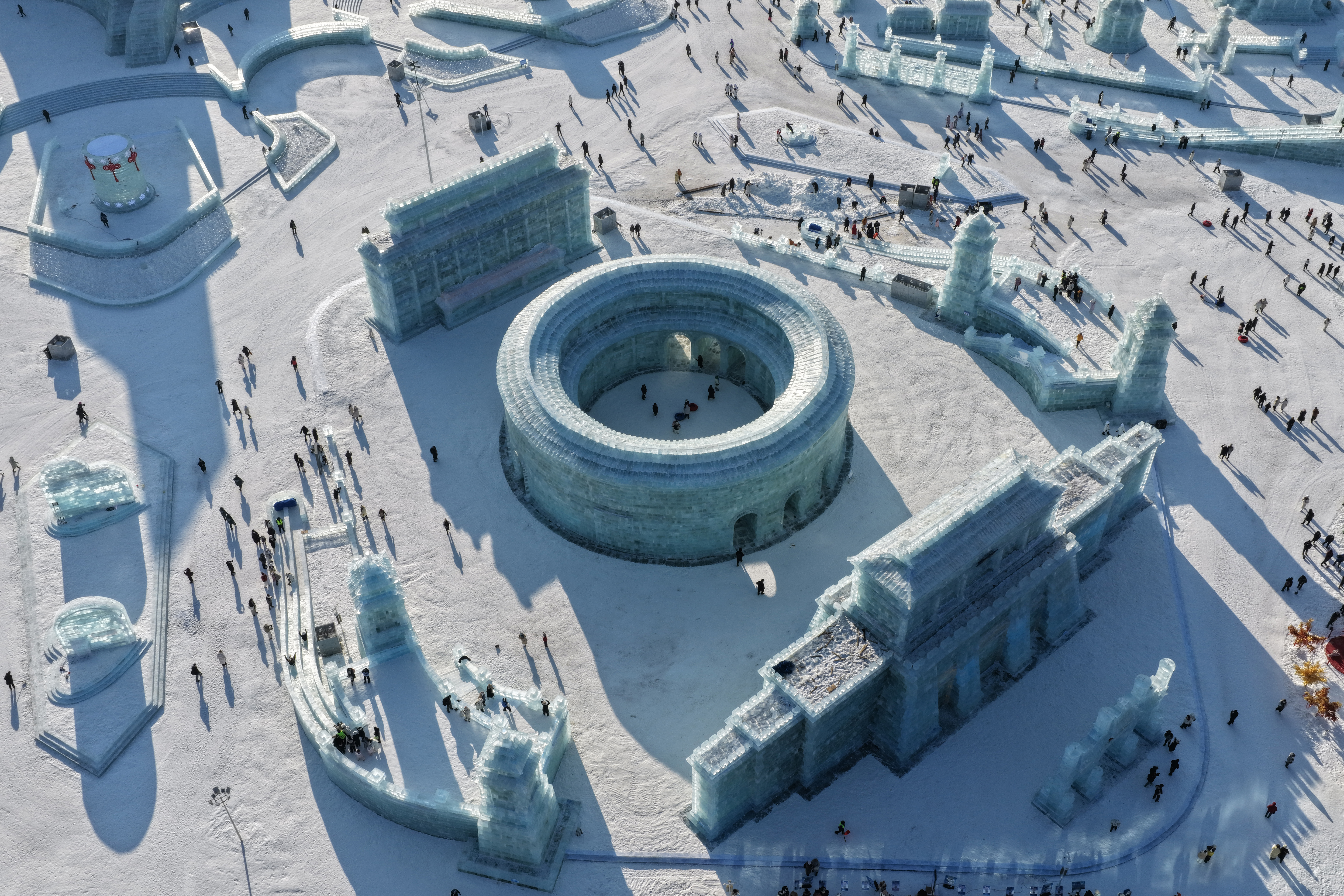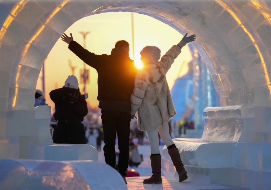 游客在冰雪大世界内的中华巴洛克景观区域内游玩。中新社
