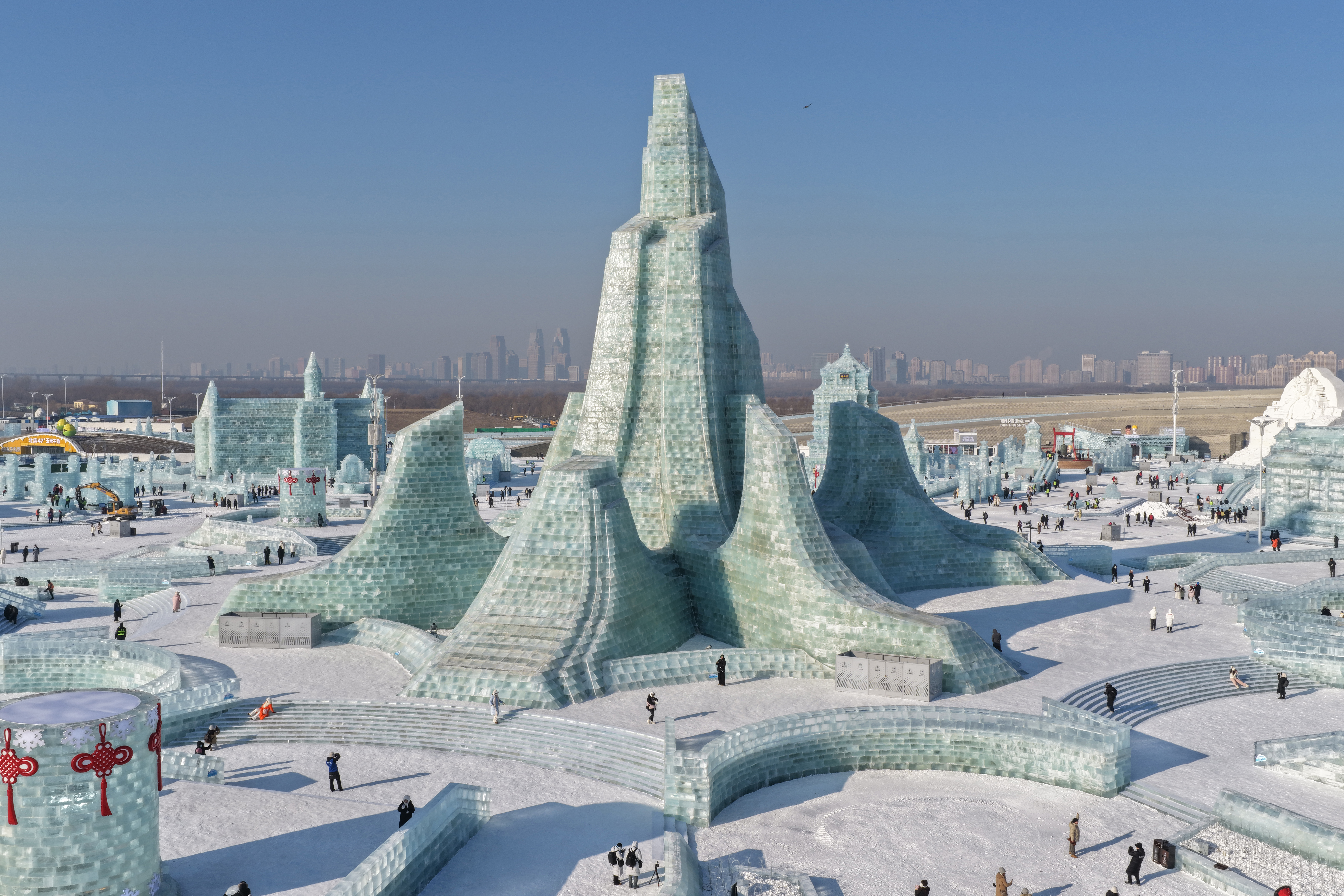 哈尔滨冰雪大世界园区内的冰建景观。新华社
