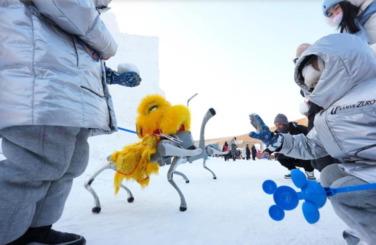 12月17日,游客在哈尔滨冰雪大世界园区内与机器狗互动。新华社